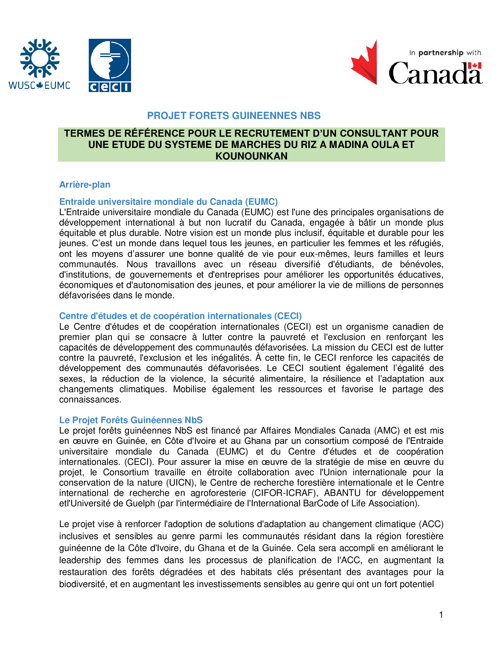 > TERMES DE RÉFÉRENCE POUR LE RECRUTEMENT D’UN CONSULTANT POUR UNE ETUDE DU SYSTEME DE MARCHES DU RIZ A MADINA OULA ET KOUNOUNKAN