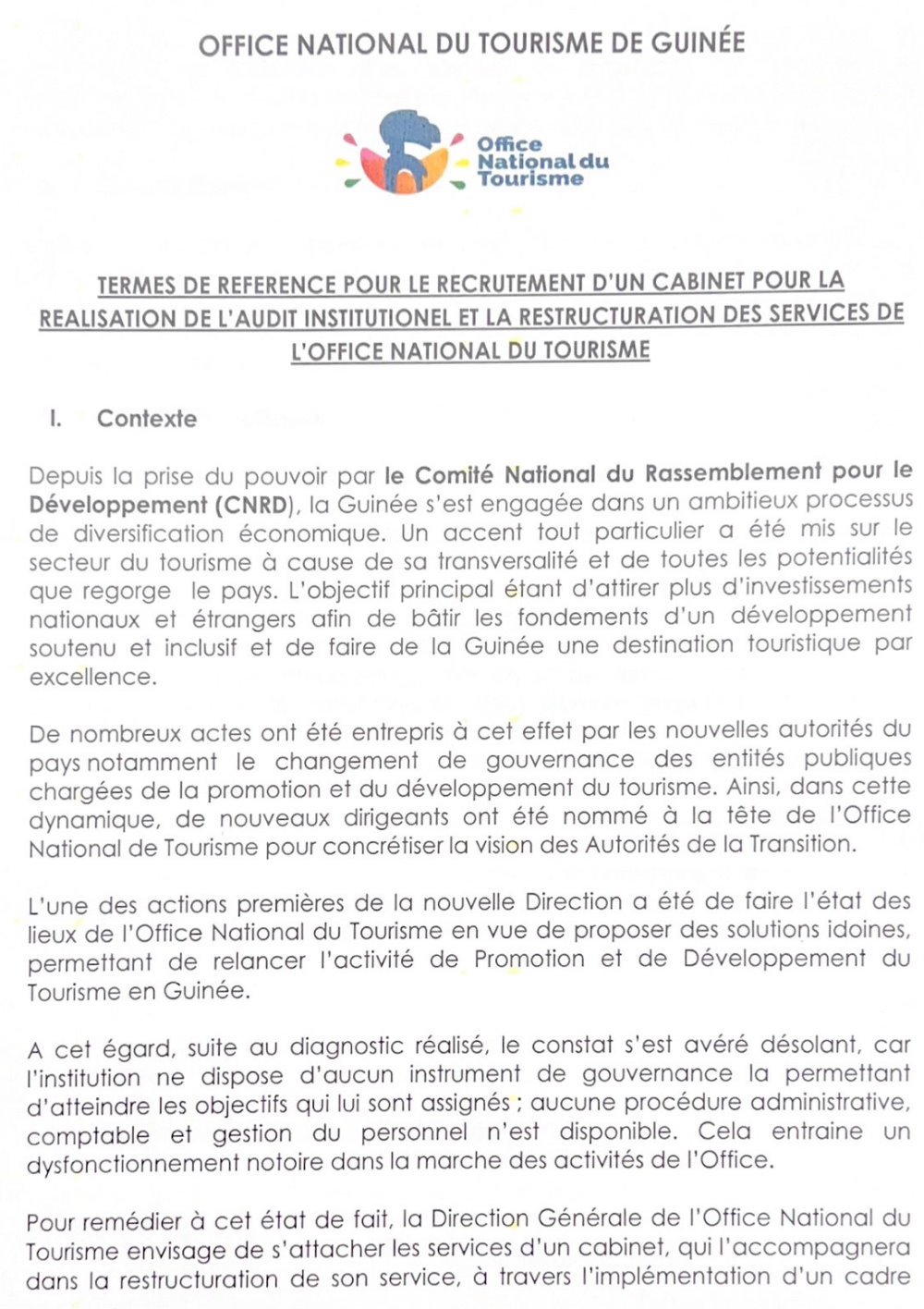 > TERMES DE REFERENCE POUR LE RECRUTEMENT D'UN CABINET POUR LA RÉALISATION DE L'AUDIT INSTITUTIONNEL ET LA RESTRUCTURATION DES SERVICES DE L'OFFICE NATIONAL DU TOURISME