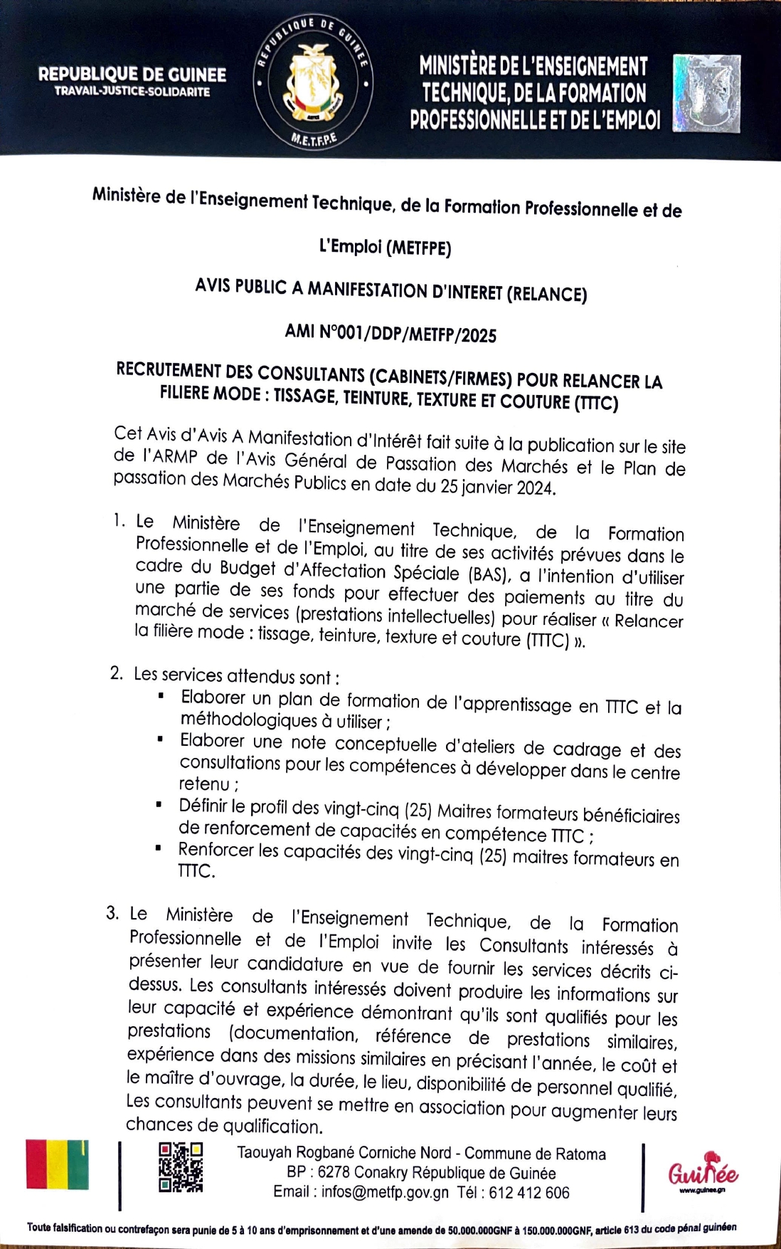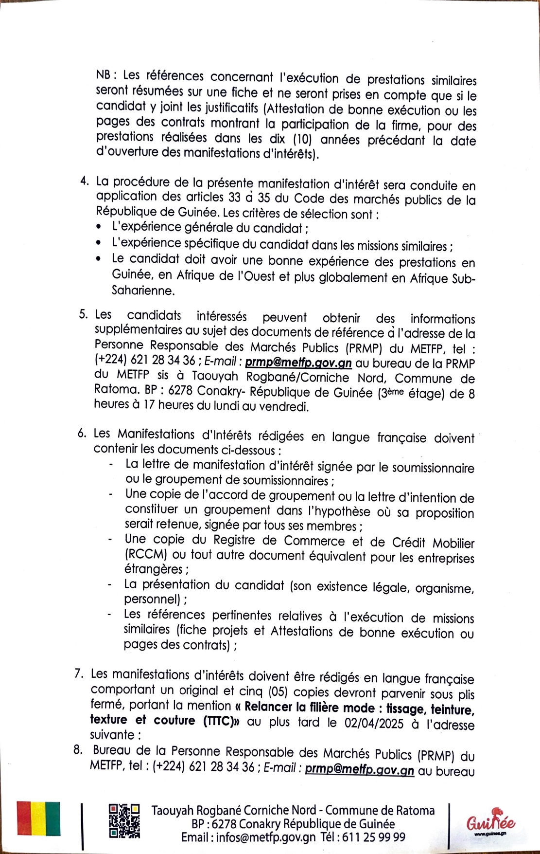 > RECRUTEMENT DES CONSULTANTS (CABINETS/FIRMES) POUR RELANCER LA FILIERE MODE : TISSAGE, TEINTURE, TEXTURE ET COUTURE (TTTC)