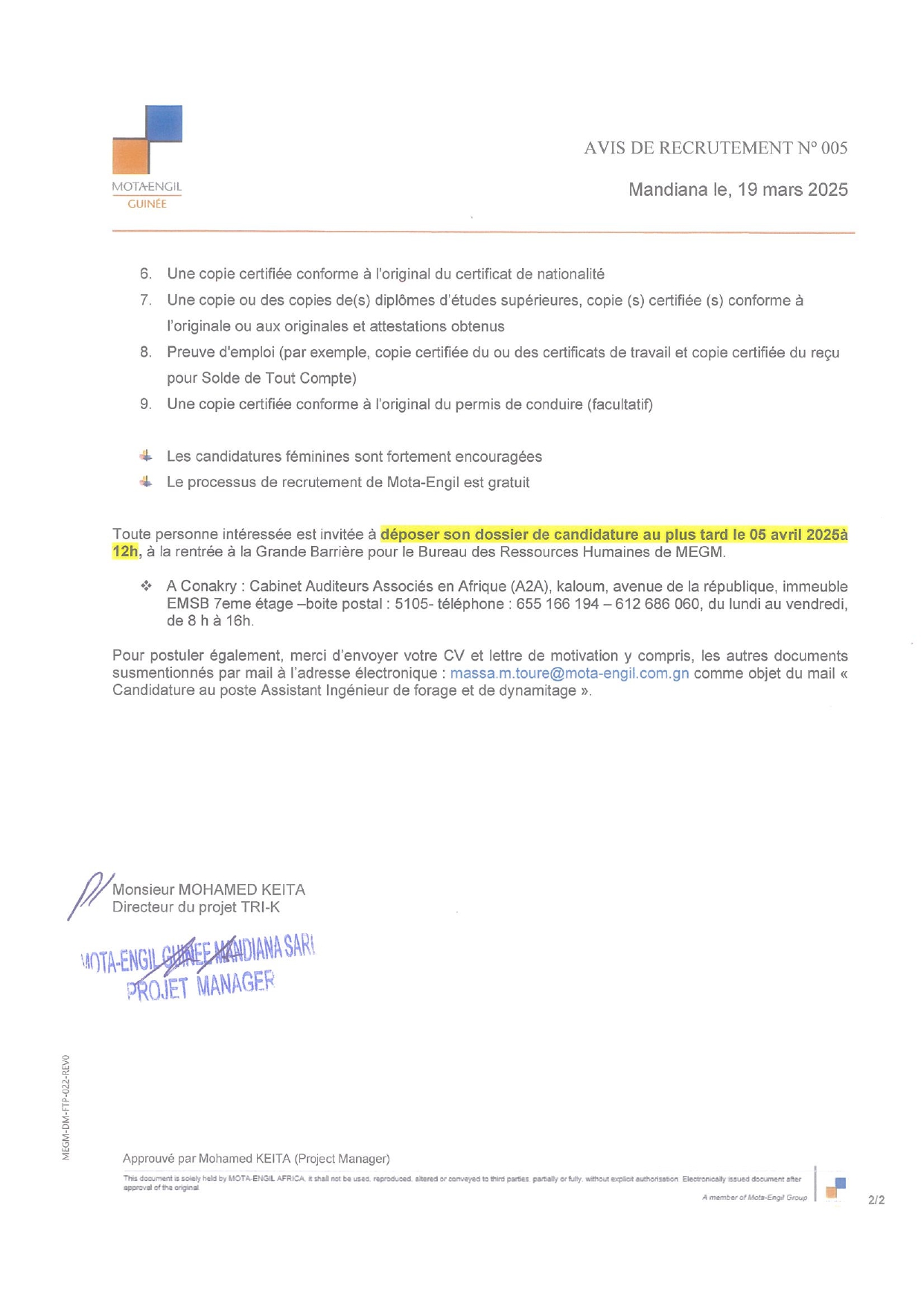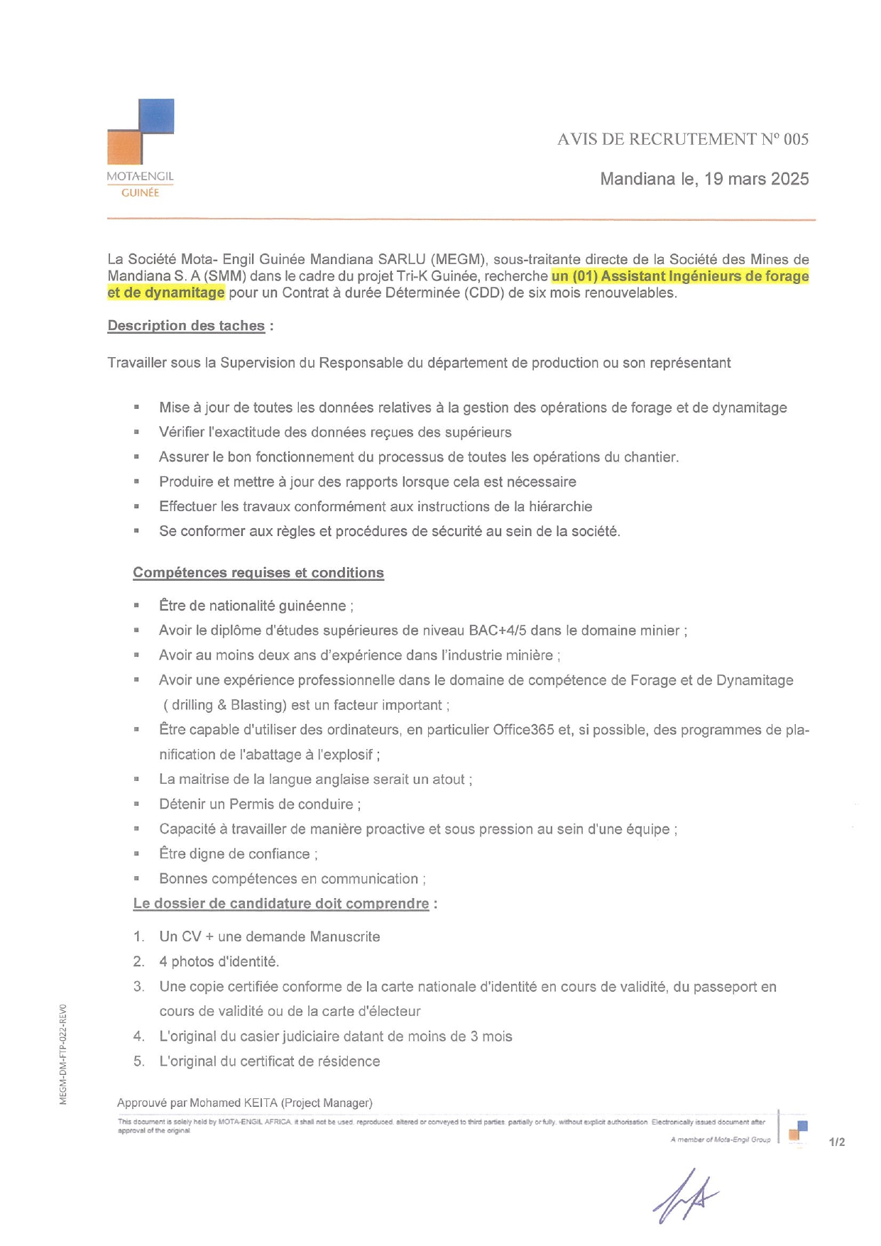 > Avis de recrutement d'un (01) Assistant Ingénieurs de forage et de dynamitage pour un Contrat à durée Déterminée (CDD)