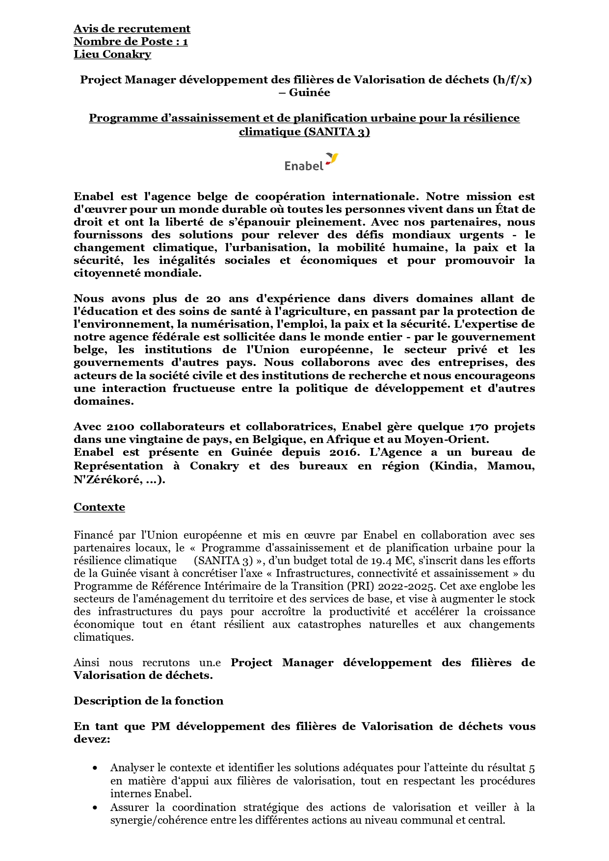 Postulez, au plus tard le 13/04/2025, ici PM développement des filières de Valorisation de déchets (enabel.be) et joignez votre CV actualisé, une lettre de
