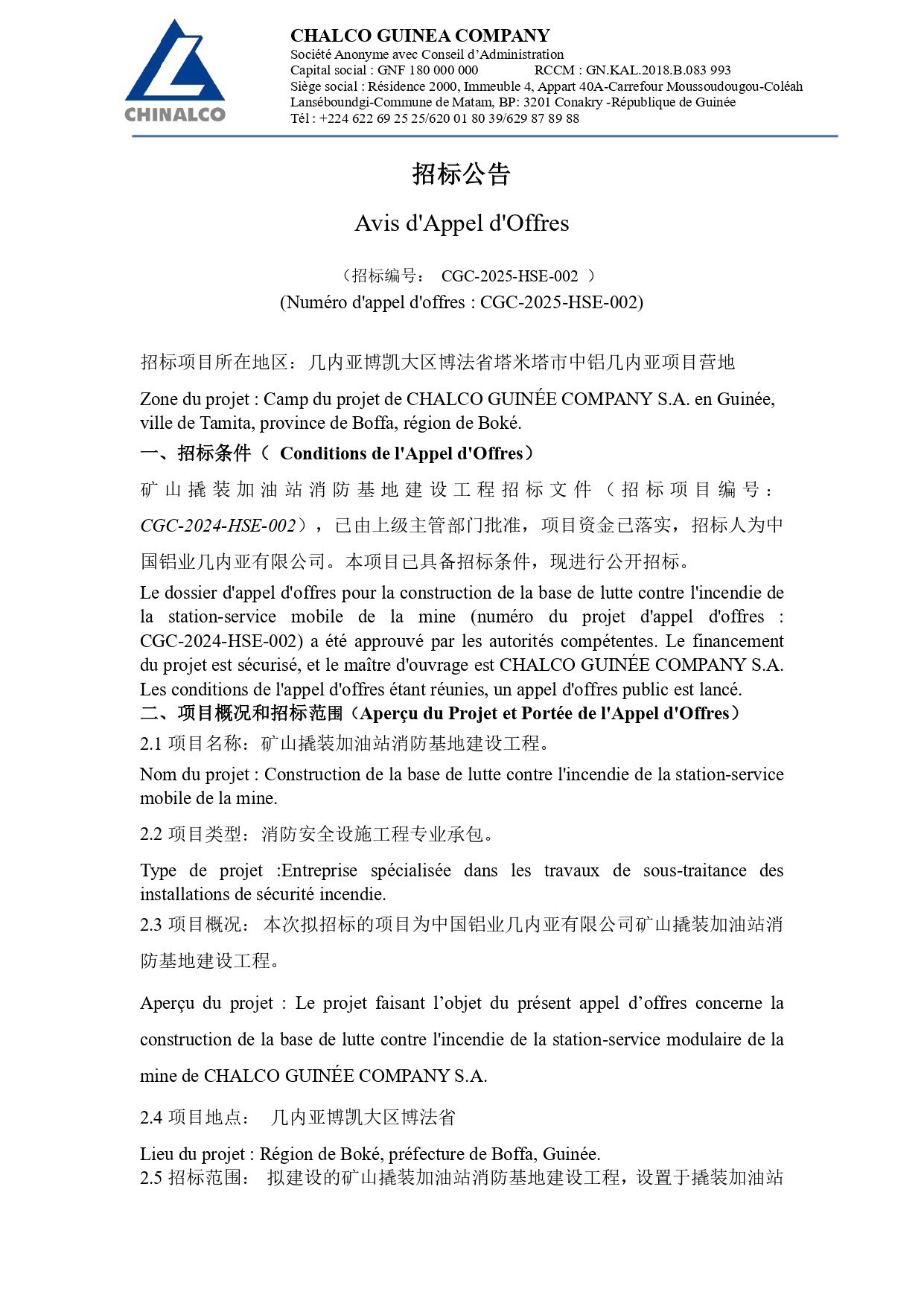 > DOSSIER D'APPEL D'OFFRES POUR LA CONSTRUCTION DE LA BASE DE LUTTE CONTRE LES INCENDIES DE LA STATION-SERVICE SKID DU SITE MINIER DE CHALCO GUINÉE COMPANY S.A