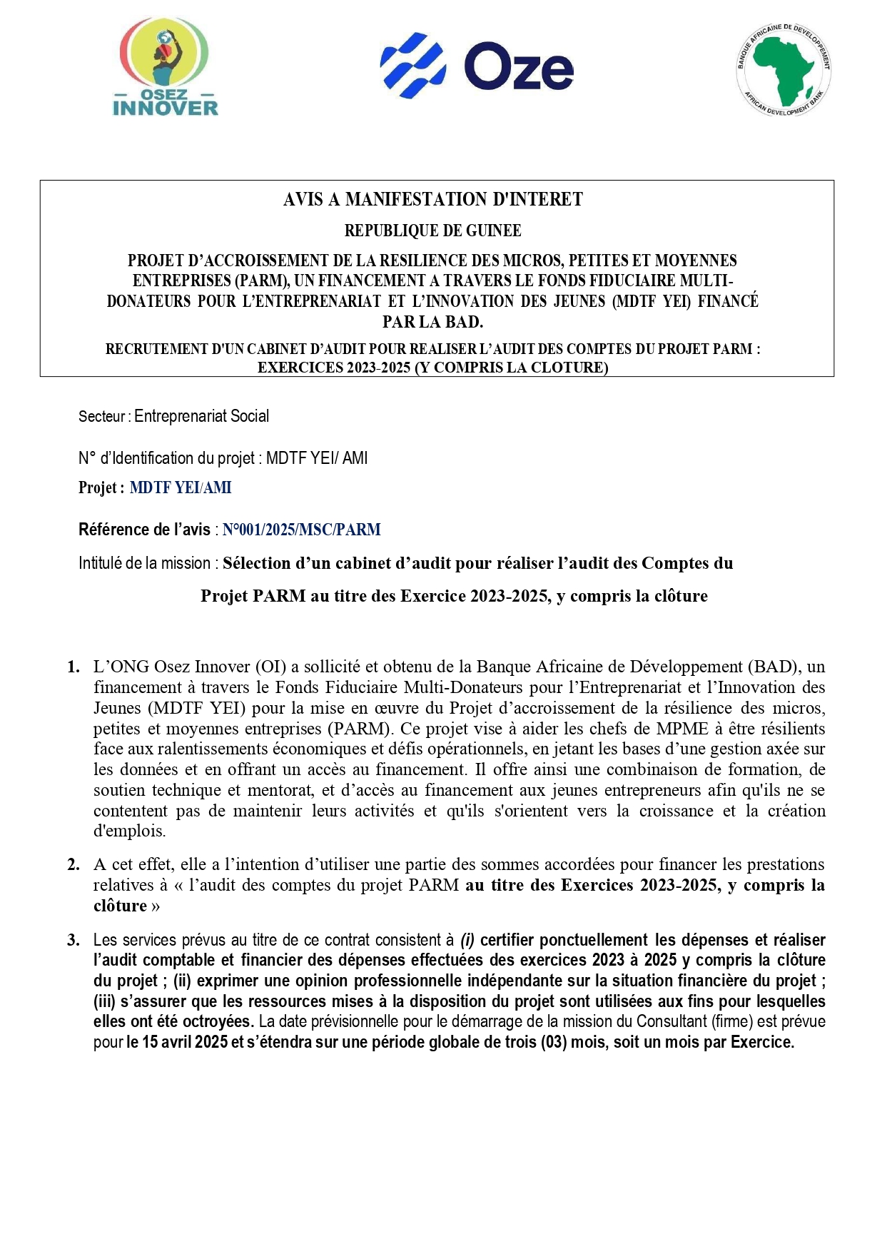 > AVIS A MANIFESTATION D'INTERET POUR LE RECRUTEMENT D'UN CABINET D’AUDIT POUR REALISER L’AUDIT DES COMPTES DU PROJET PARM : EXERCICES 2023-2025 (Y COMPRIS LA CLOTURE)