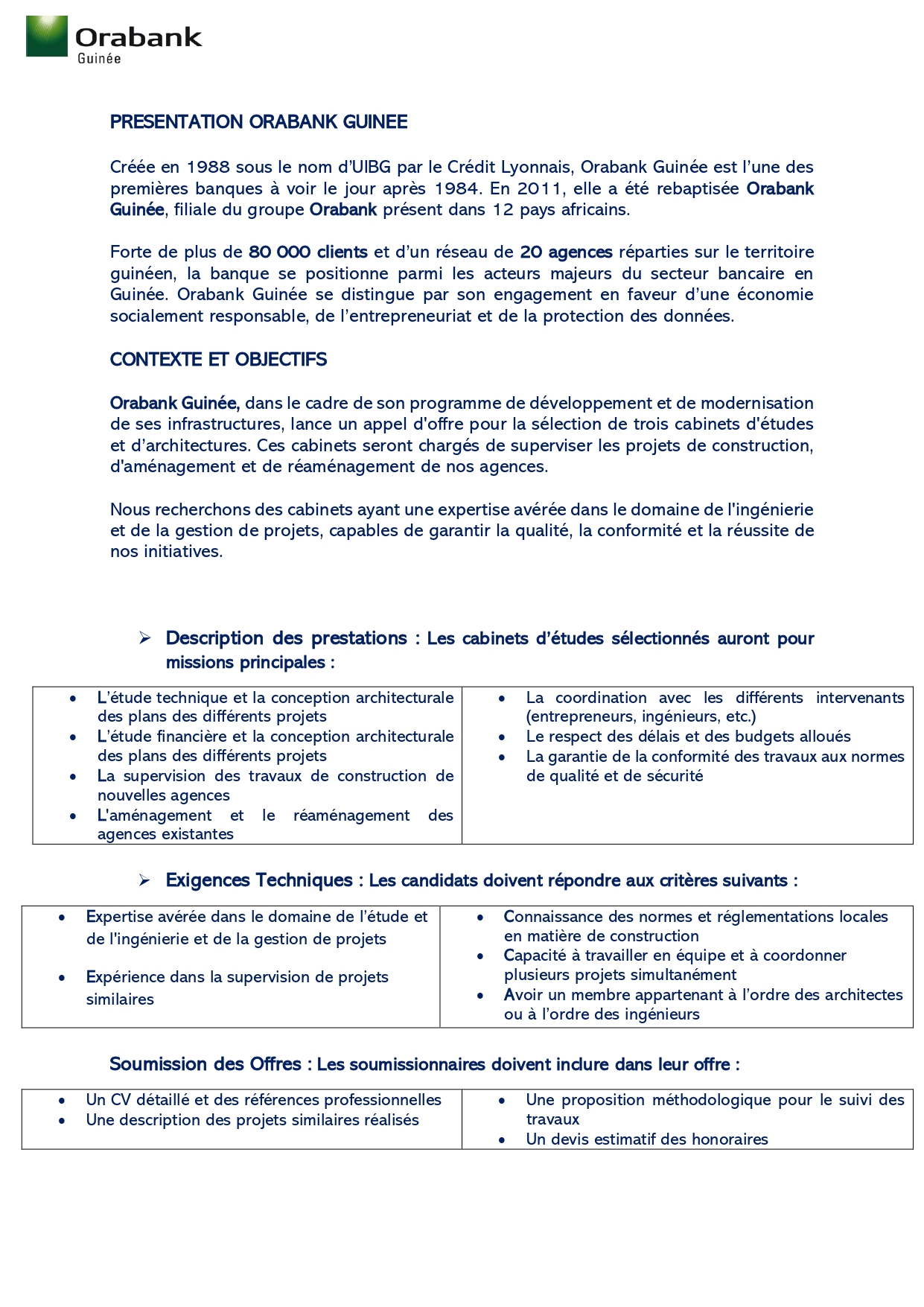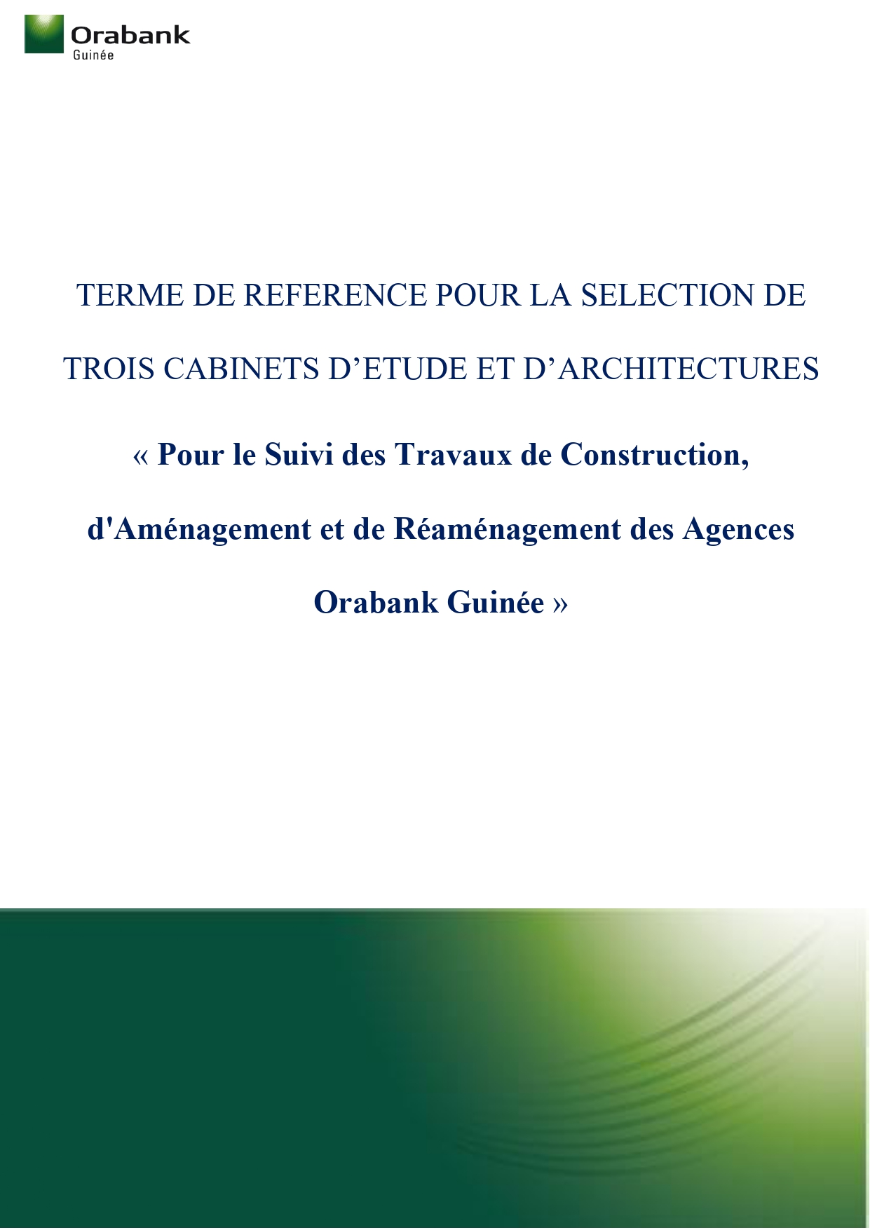 > TERME DE REFERENCE POUR LA SELECTION DE TROIS CABINETS D’ETUDE ET D’ARCHITECTURES Pour le Suivi des Travaux de Construction, d'Aménagement et de Réaménagement des Agences Orabank Guinée