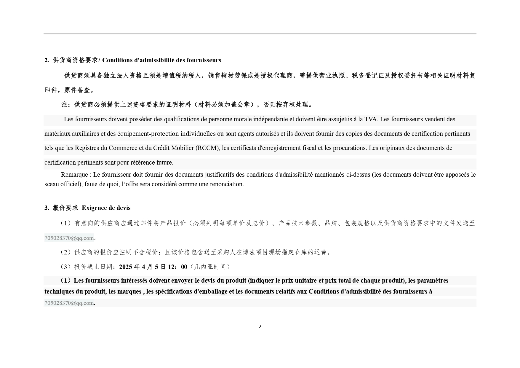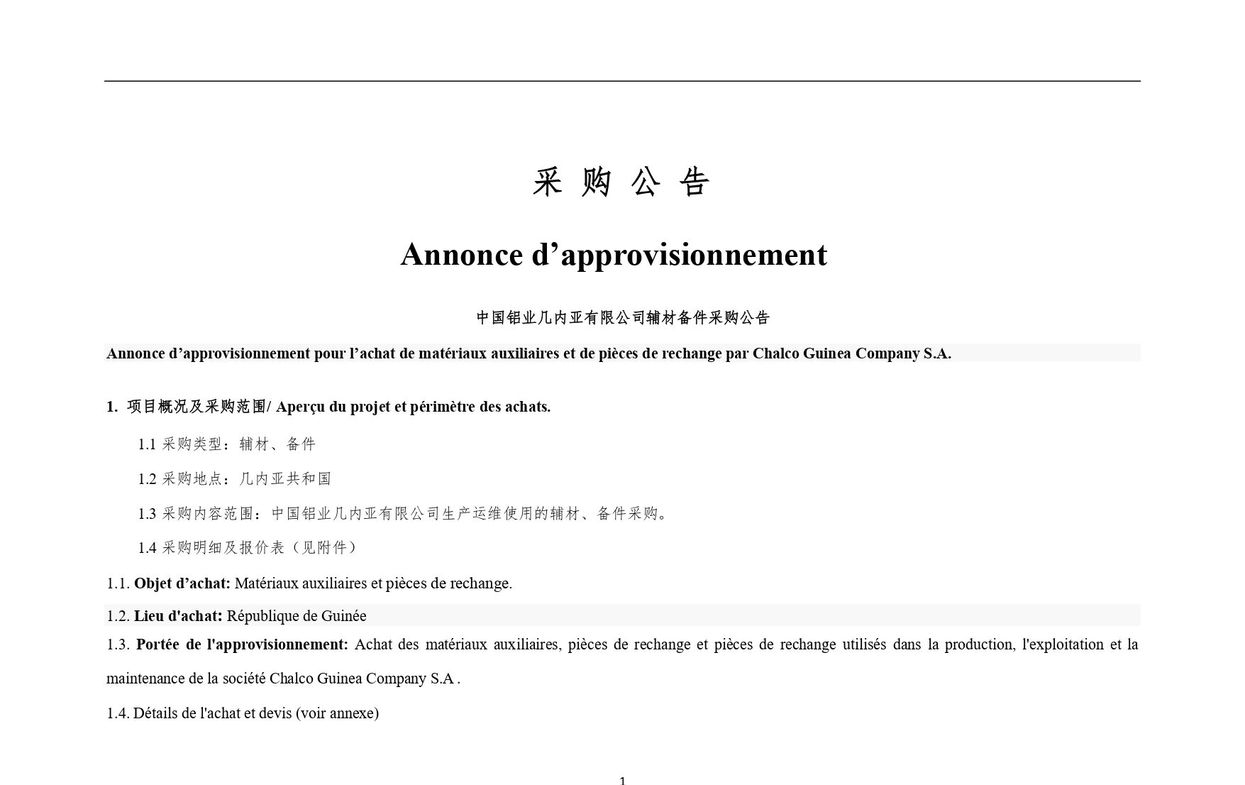 > Annonce d’approvisionnement pour l’achat de matériaux auxiliaires et de pièces de rechange par Chalco Guinea Company S.A.