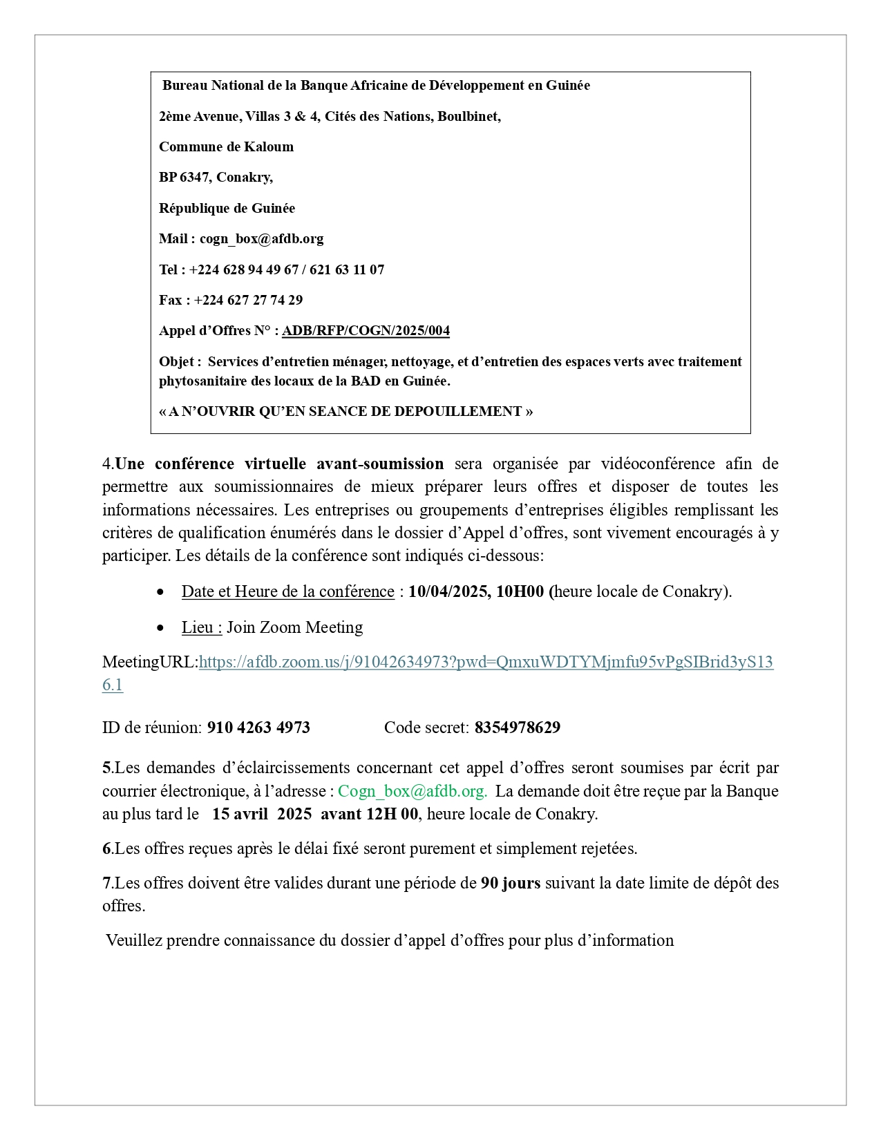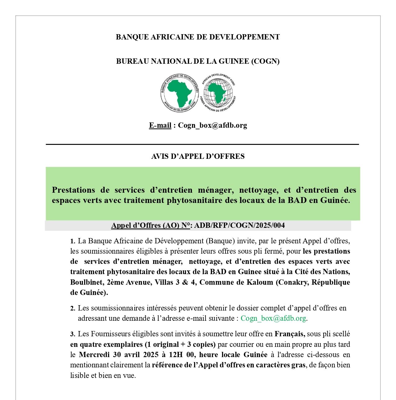 > AVIS D’APPEL D’OFFRES pour des Prestations de services d’entretien ménager, nettoyage, et d’entretien des espaces verts avec traitement phytosanitaire des locaux de la BAD en Guinée.