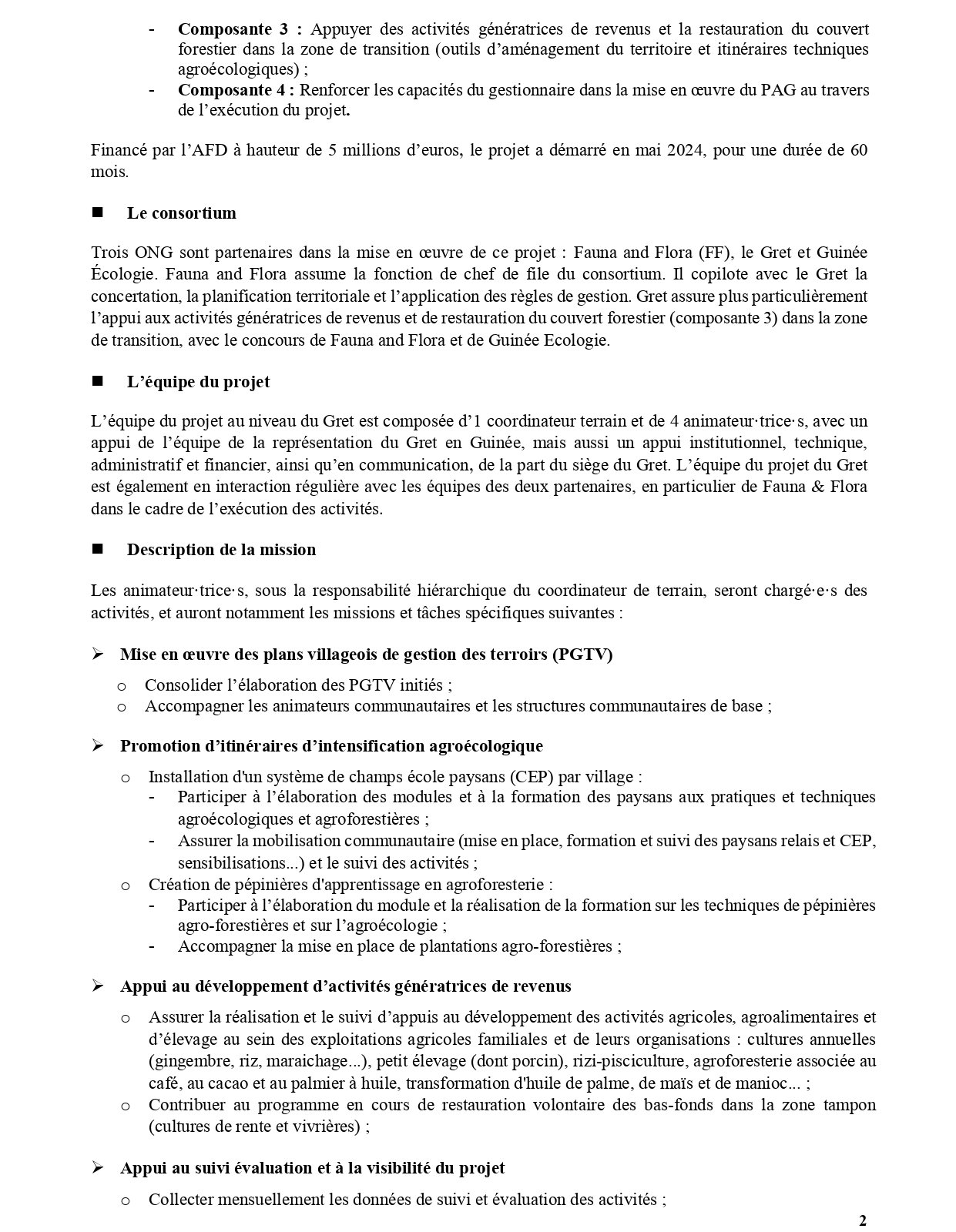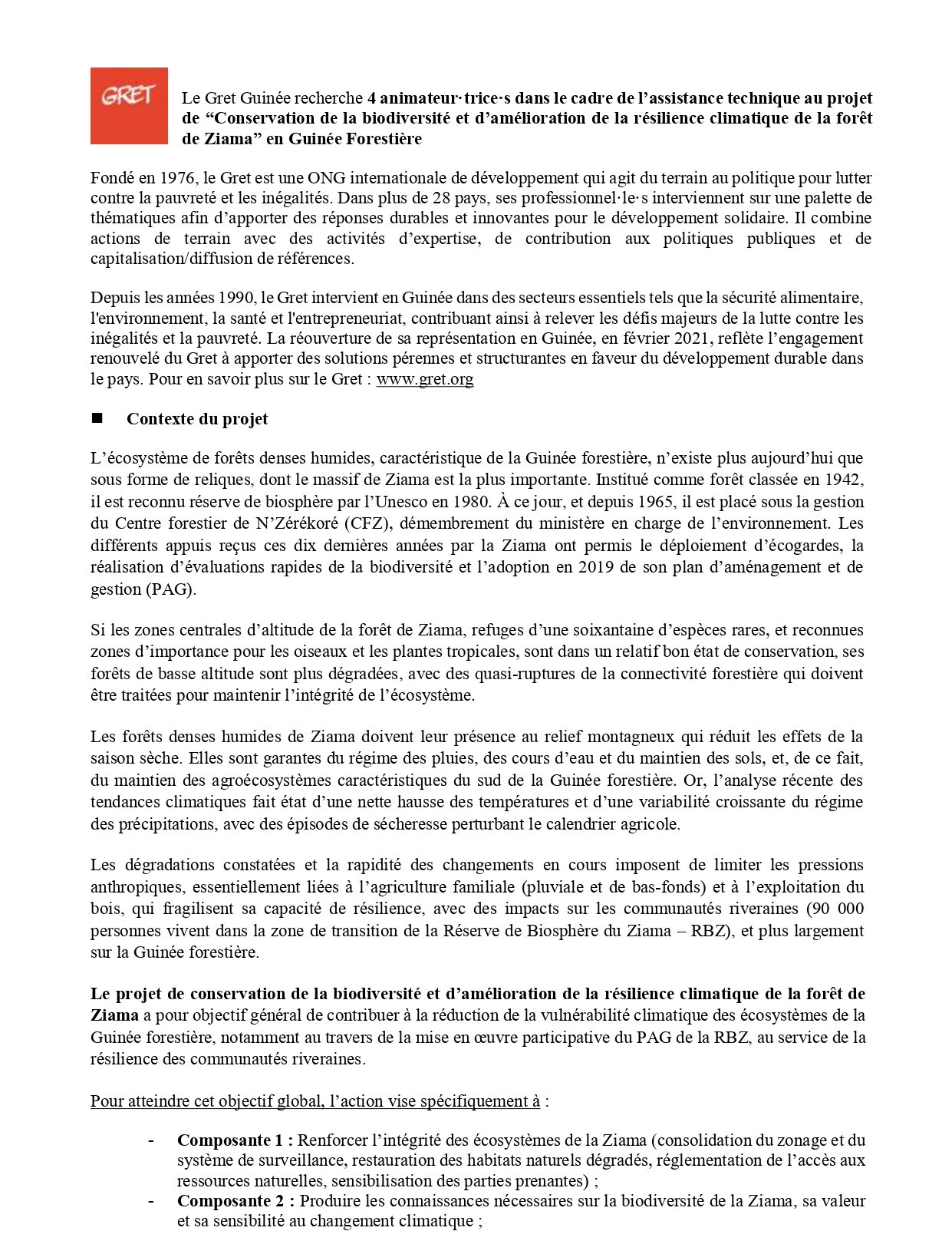 > Avis de recrutement de 4 animateur·trice·s dans le cadre de l’assistance technique au projet de “Conservation de la biodiversité et d’amélioration de la résilience climatique de la forêt de Ziama” en Guinée Forestière