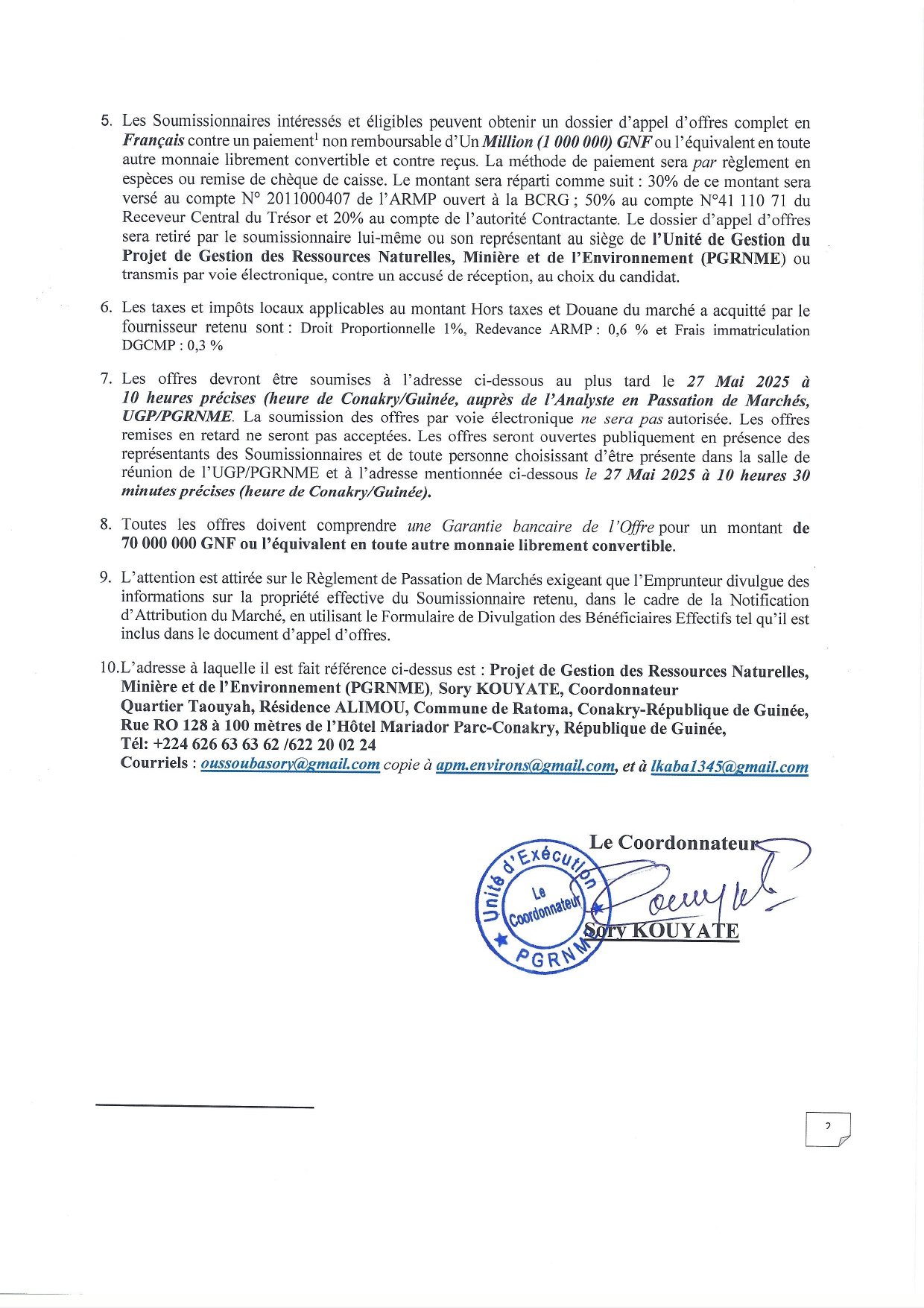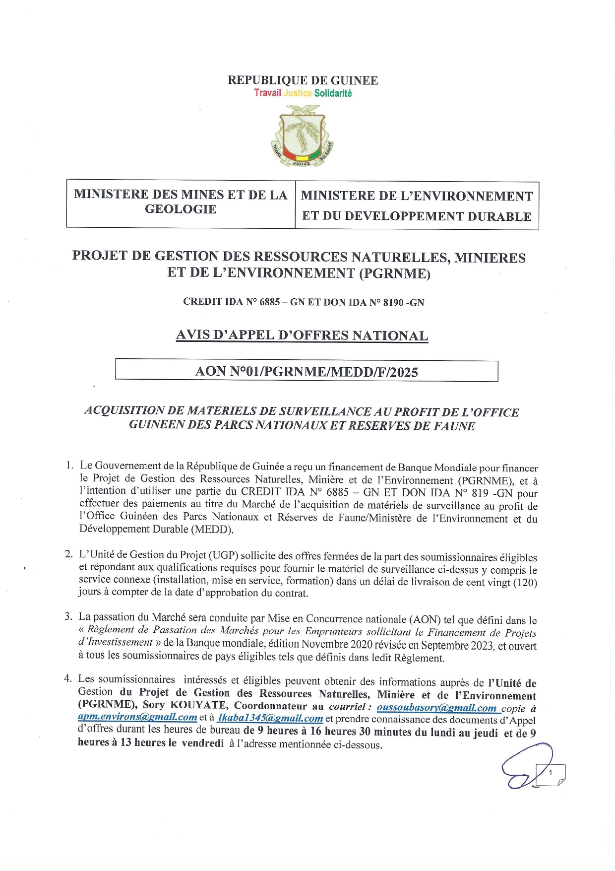 > AVIS D’APPEL D’OFFRES NATIONAL POUR L'ACQUISITION DE MATERIELS DE SURVEILLANCE AU PROFIT DE L’OFFICE GUINEEN DES PARCS NATIONAUX ET RESERVES DE FAUNE