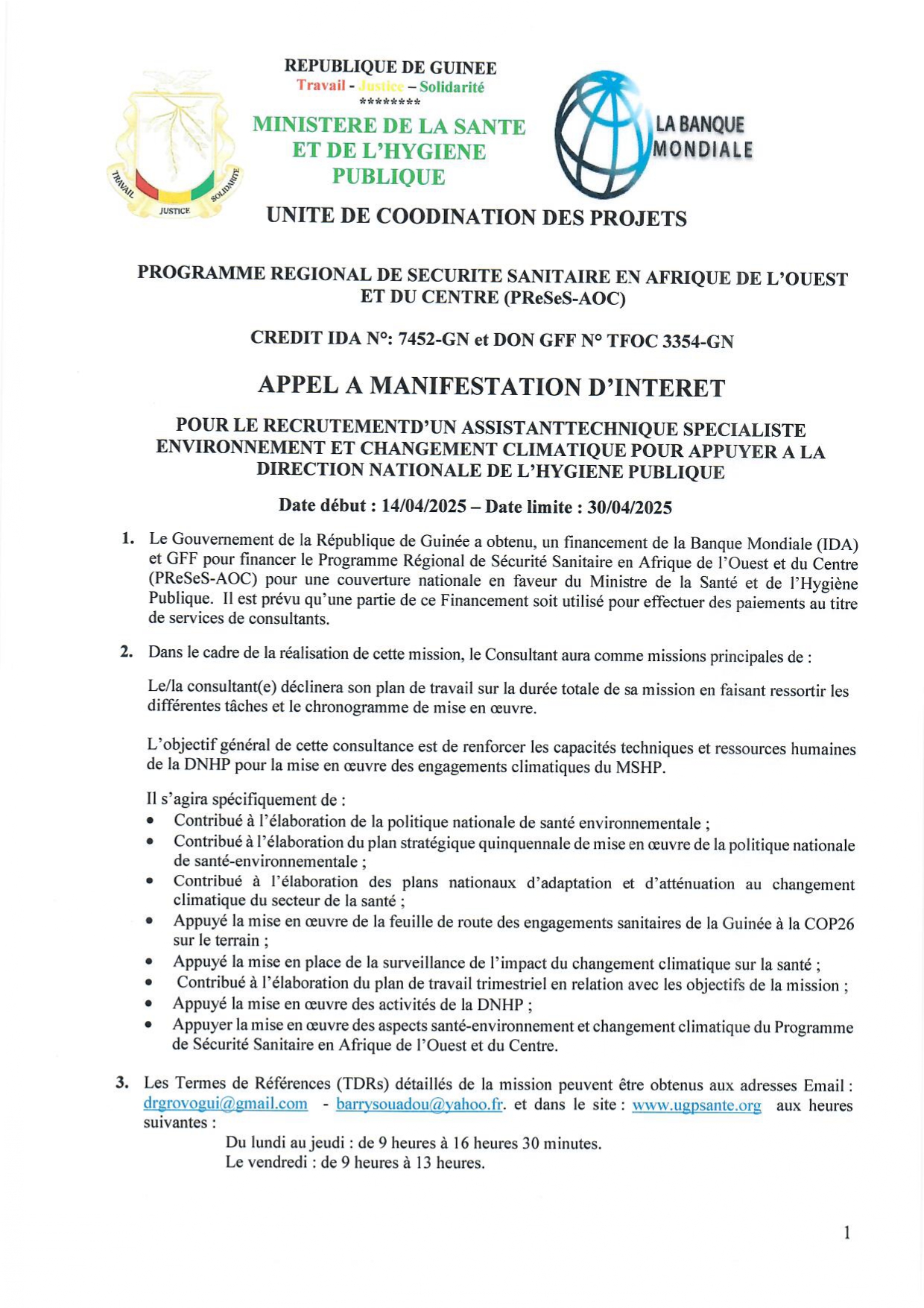 > PReSeS-AOC: APPEL A MANIFESTATION D’INTERET POUR LE RECRUTEMENTD’UN ASSISTANTTECHNIQUE SPECIALISTE ENVIRONNEMENT ET CHANGEMENT CLIMATIQUE POUR APPUYER A LA DIRECTION NATIONALE DE L’HYGIENE PUBLIQUE