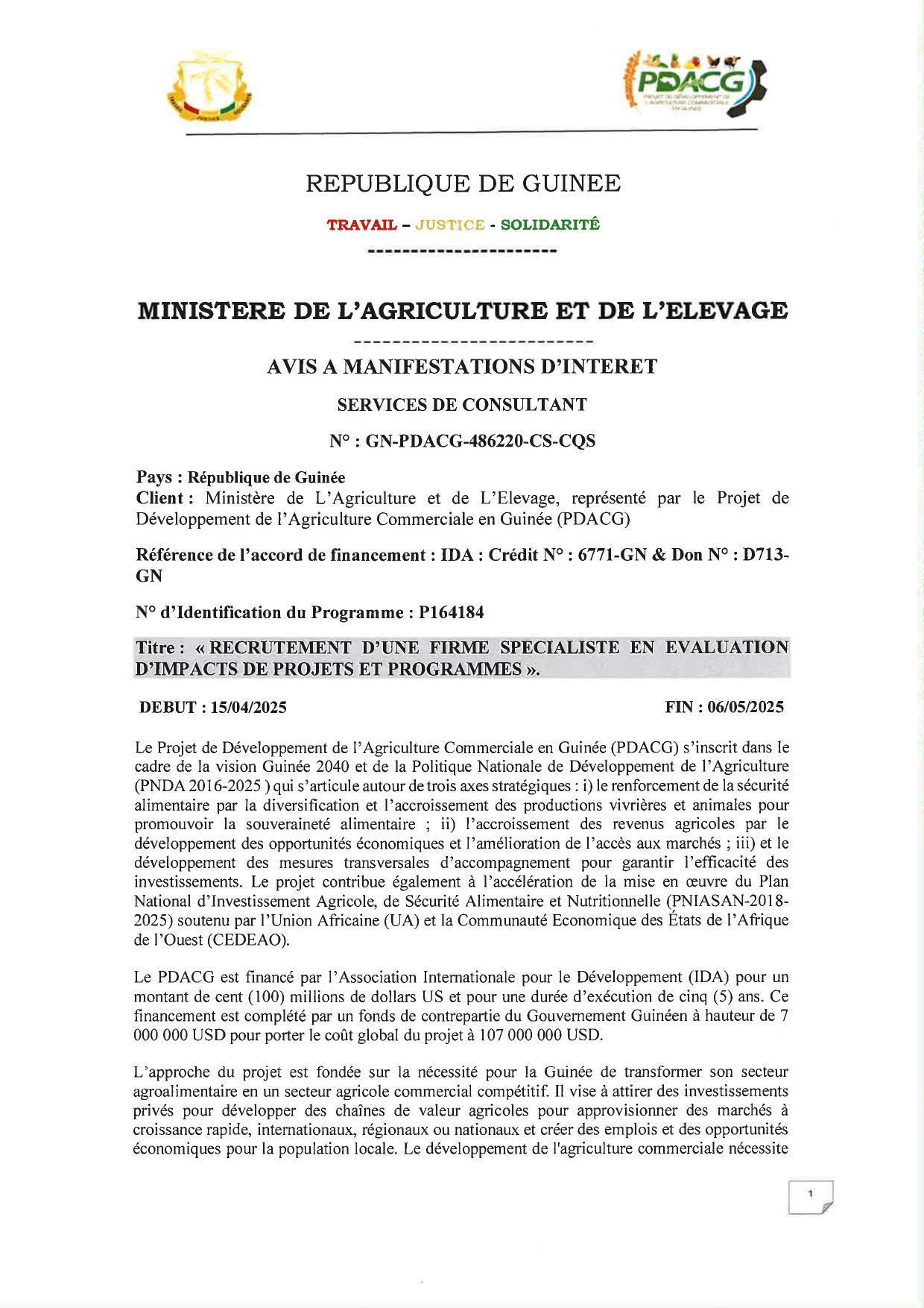> AVIS A MANIFESTATIONS D’INTERET POUR LE « RECRUTEMENT D’UNE FIRME SPECIALISTE EN EVALUATION D’IMPACTS DE PROJETS ET PROGRAMMES