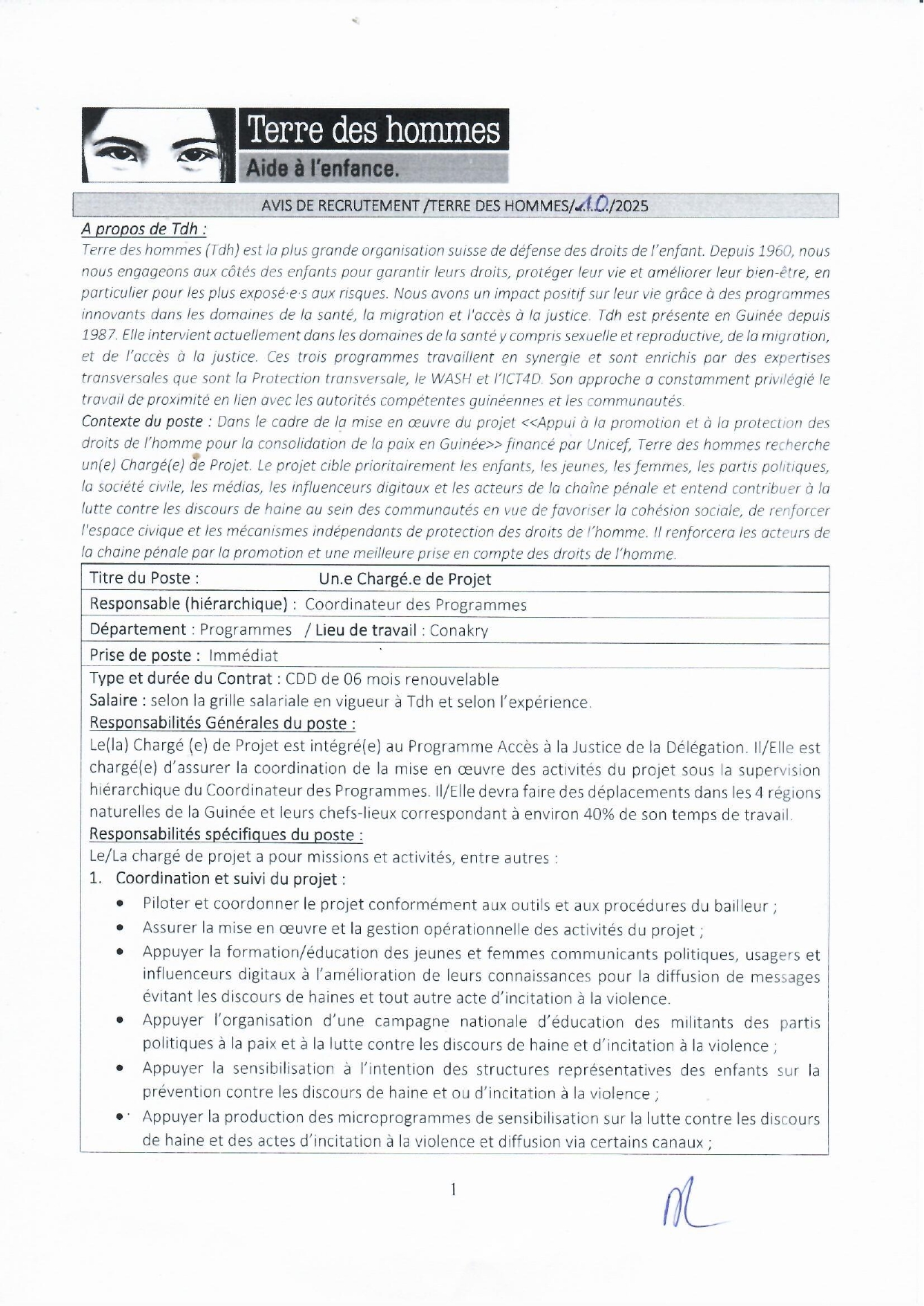 | Lieu d'affectation : | Guinée |