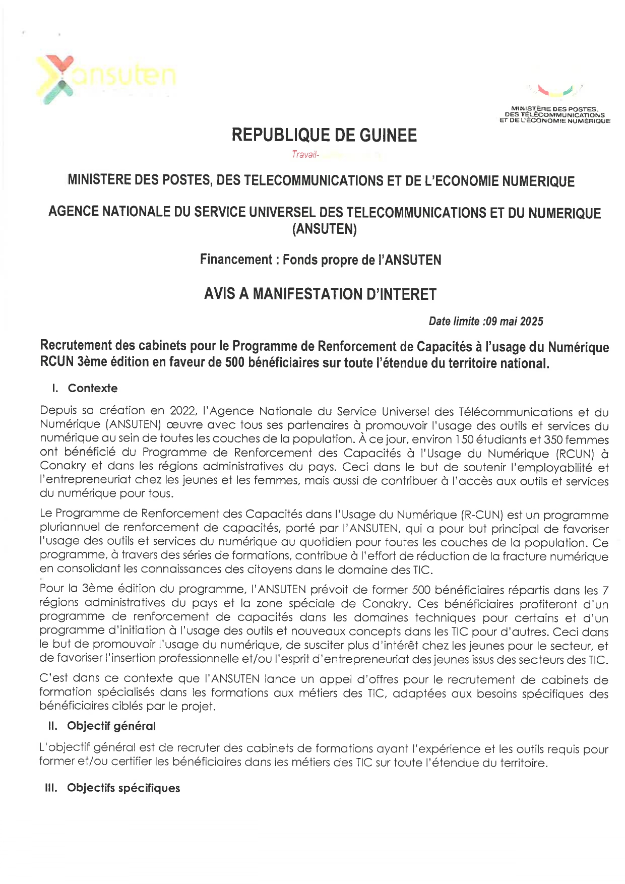 > Avis à manifestation d'intérêt pour le Recrutement des cabinets pour le Programme de Renforcement de Capacités à l’usage du Numérique RCUN 3ème édition en faveur de 500 bénéficiaires sur toute l’étendue du territoire national.