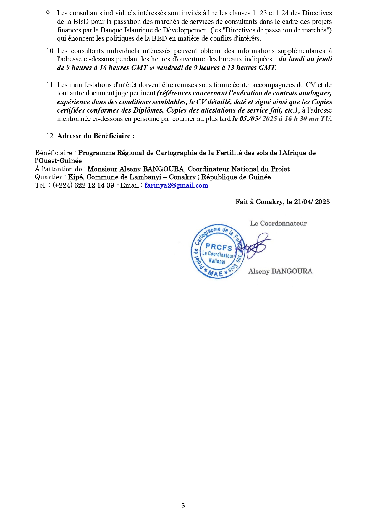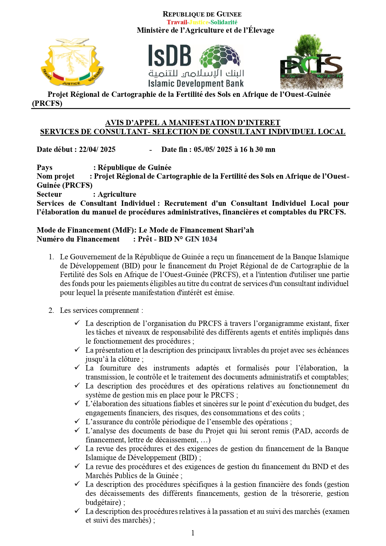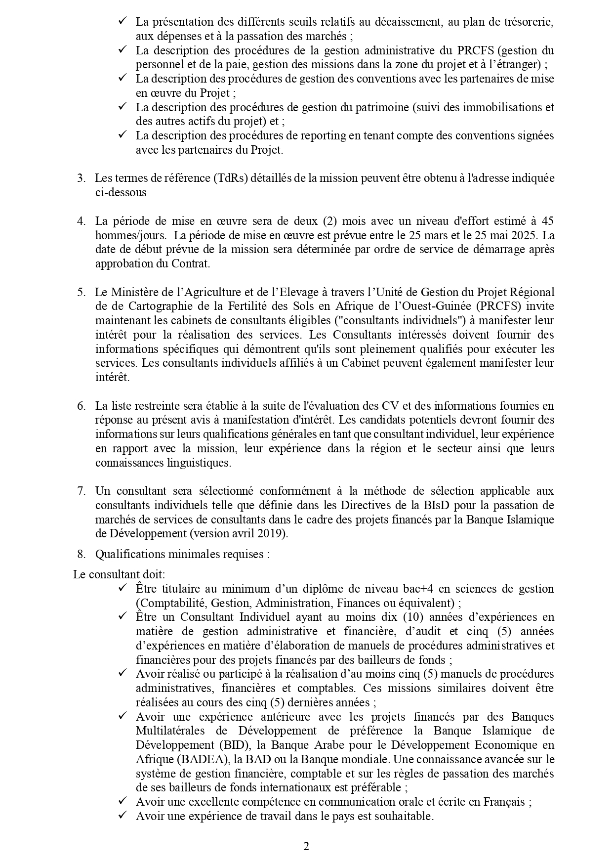 > AVIS D’APPEL A MANIFESTATION D’INTERET pour des Services de Consultant Individuel : Recrutement d'un Consultant Individuel Local pour l’élaboration du manuel de procédures administratives, financières et comptables du PRCFS