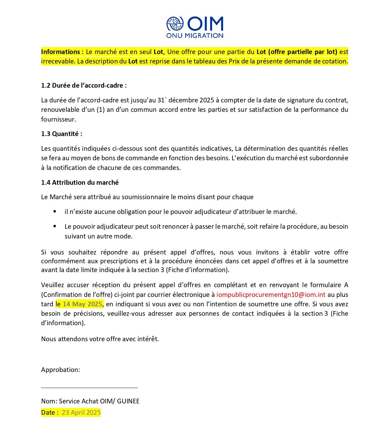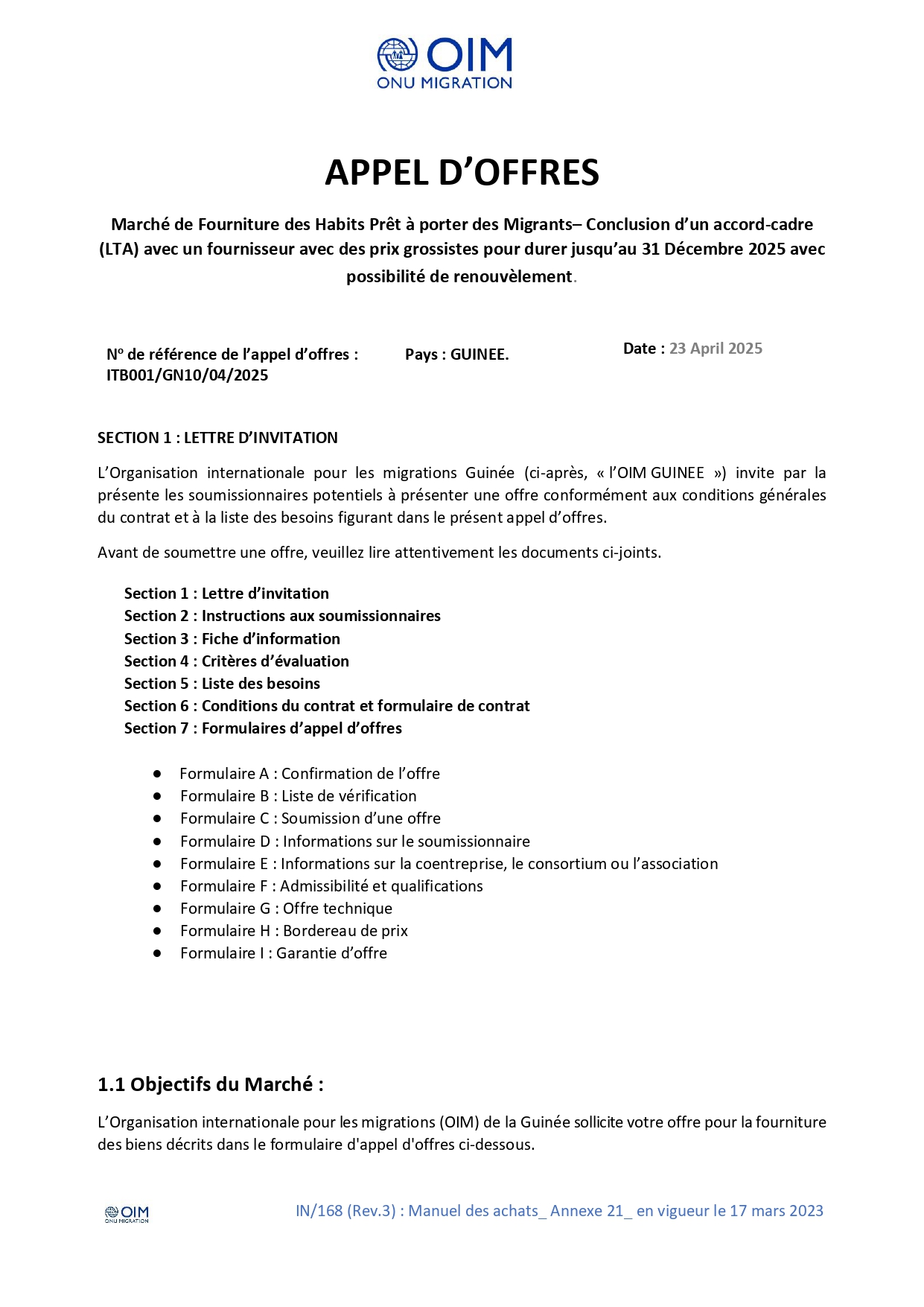 > Avis d'appel d'offres pour le Marché de Fourniture des Habits Prêt à porter des Migrants– Conclusion d’un accord-cadre (LTA) avec un fournisseur avec des prix grossistes pour durer jusqu’au 31 Décembre 2025 avec possibilité de renouvèlement