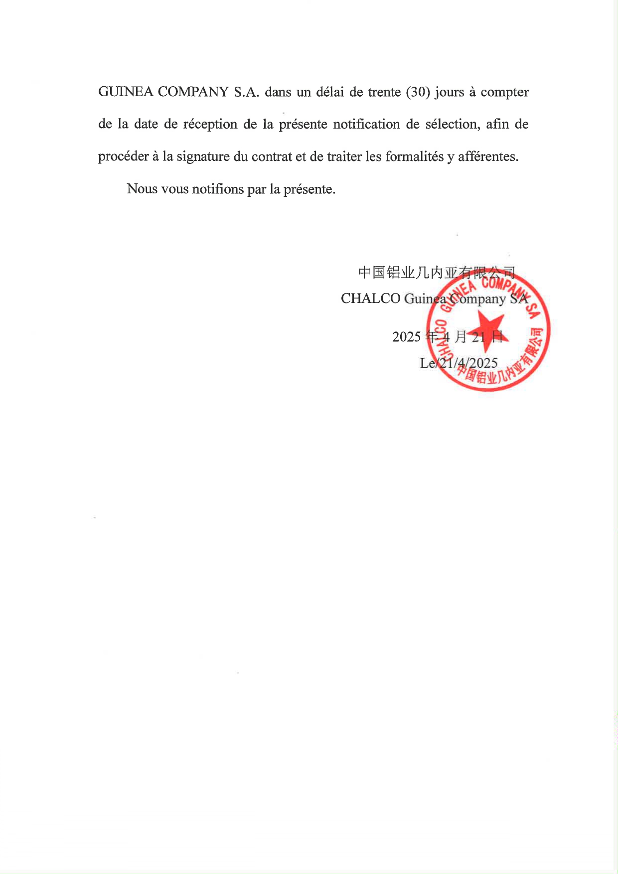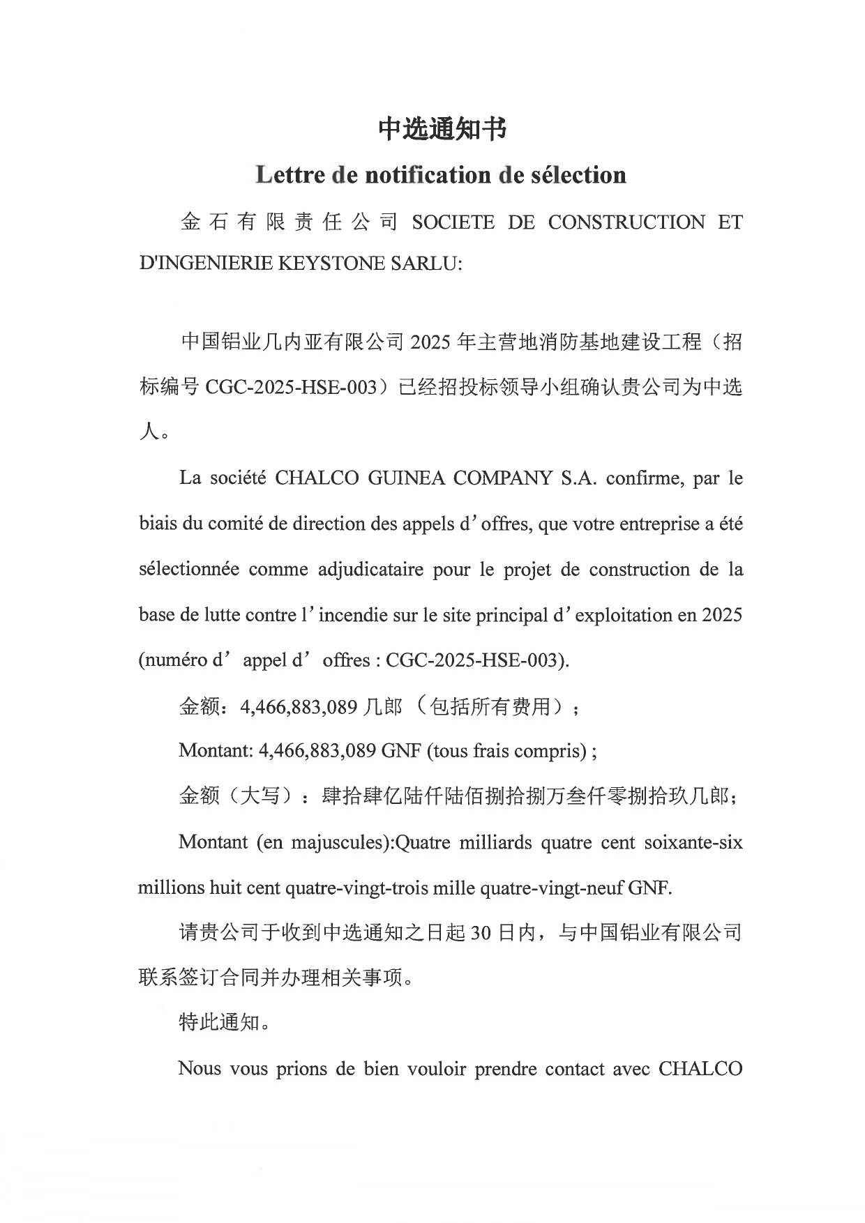 > Lettre de notification de sélection: projet de construction de la base de lutte contre incendie sur le site principal d' exploitation en 2025 (numéro d' appel d' offres : CGC-2025-HSE-003)