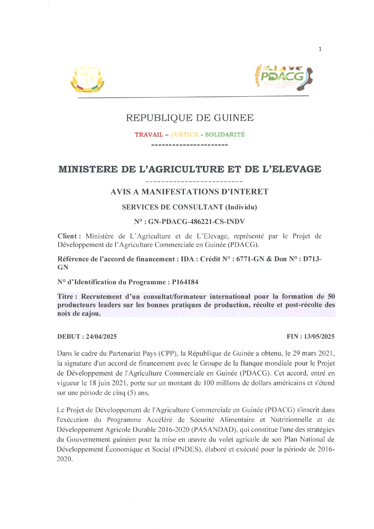 > Avis à manifestation d'intérêt pour le Recrutement d’un consultat/formateur international pour la formation de 50 producteurs leaders sur les bonnes pratiques de production, récolte et post-récolte des noix de cajou.