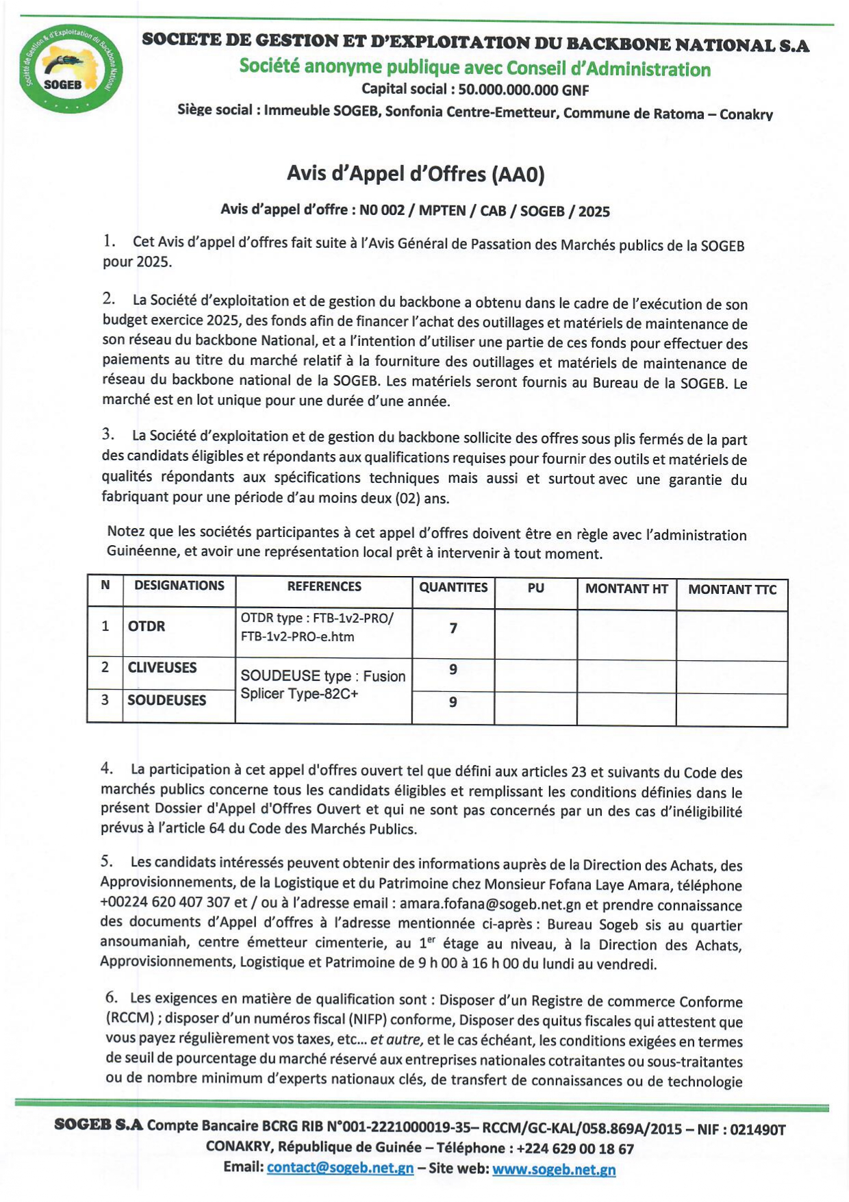 > Avis d'appel d'offres pour le marché relatif à la fourniture des outillages et matériels de maintenance de réseau du backbone national de la SOGEB