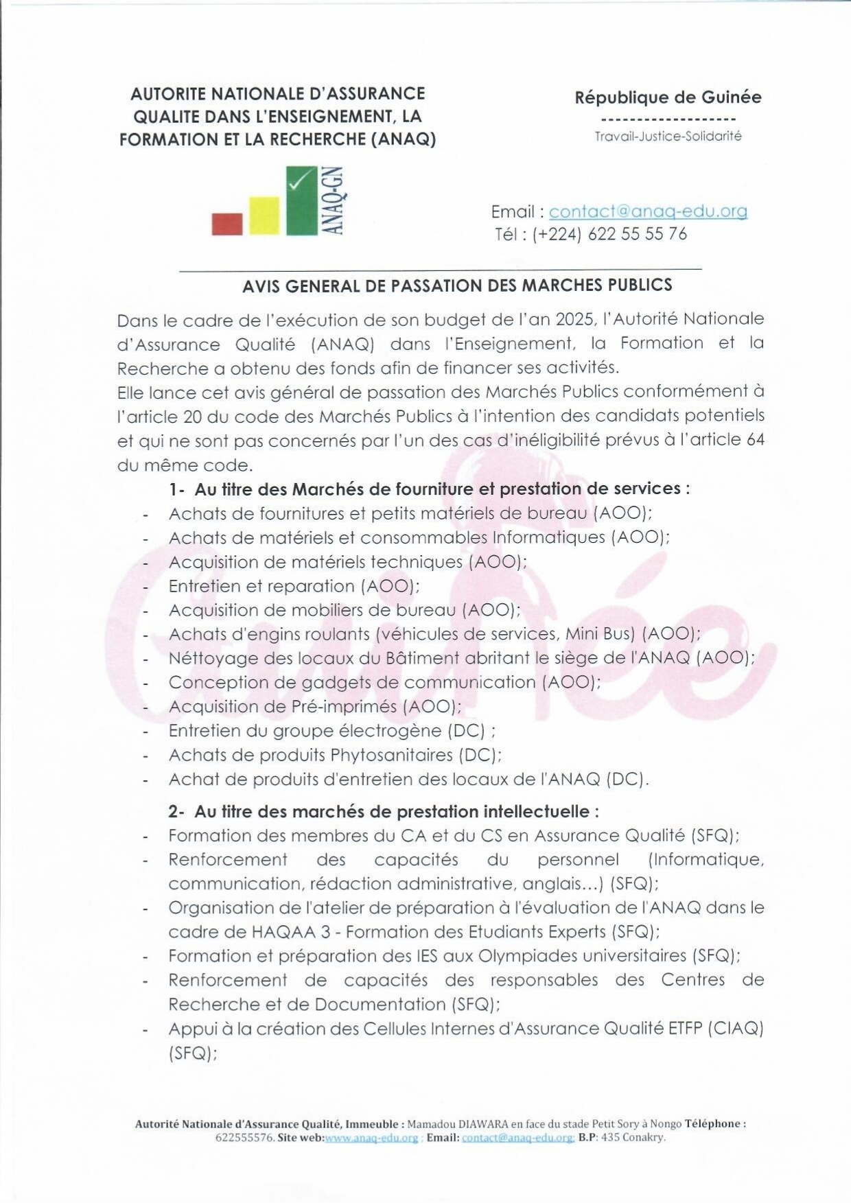 > AVIS GENERAL DE PASSATION DES MARCHES PUBLICS : AUTORITE NATIONALE D'ASSURANCE QUALITE DANS L'ENSEIGNEMENT, LA FORMATION ET LA RECHERCHE (ANAQ)