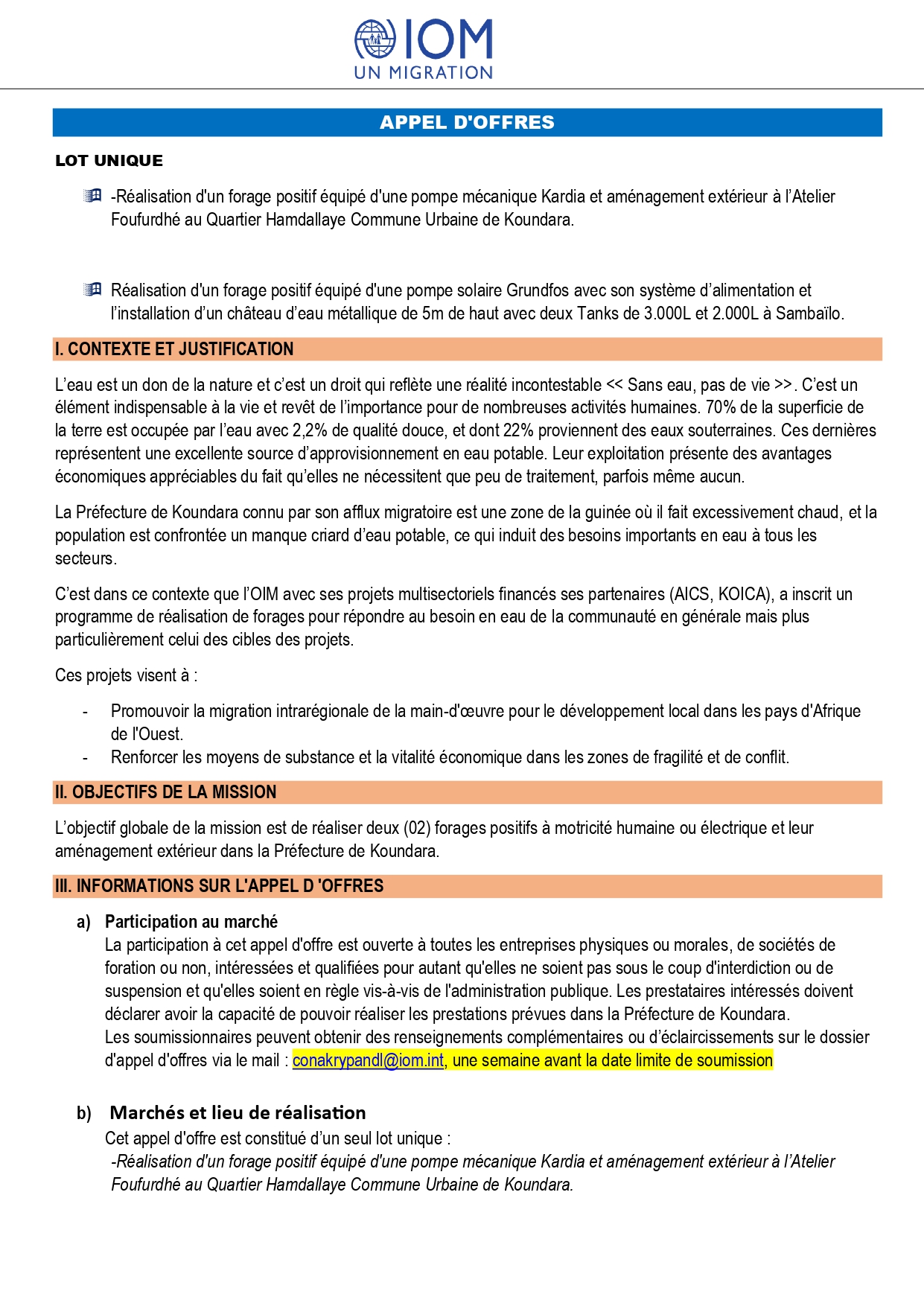 > Avis d'appel d'offres pour la Réalisation d'un forage positif équipé d'une pompe mécanique Kardia et aménagement extérieur à l’Atelier Foufurdhé au Quartier Hamdallaye Commune Urbaine de Koundara