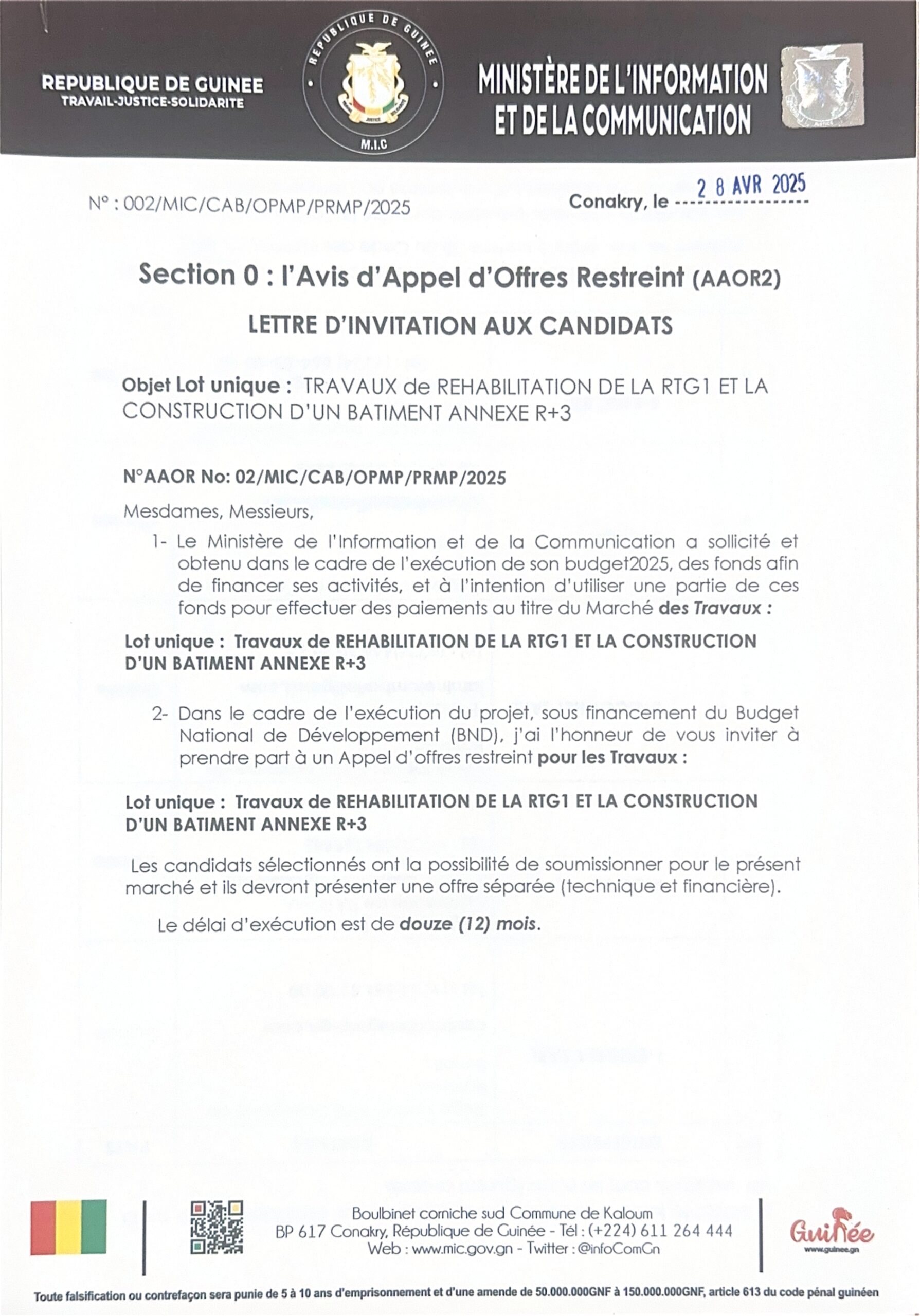 > Avsi d'appel d'offres international pour les Travaux de REHABILITATION DE LA RTG1 ET LA CONSTRUCTION D'UN BATIMENT ANNEXE R+3