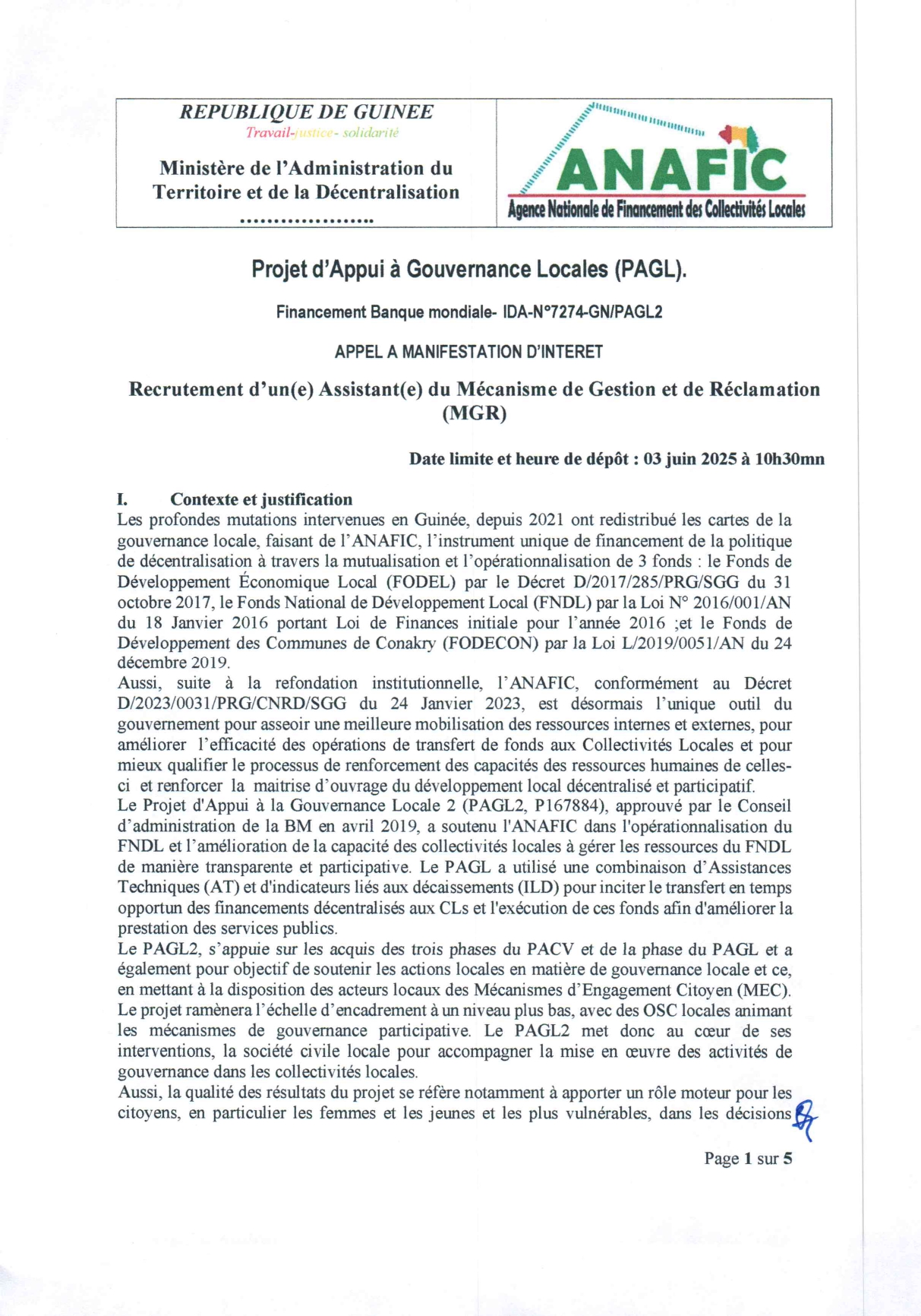> APPEL A MANIFESTATION D’INTERET Pour Le Recrutement d’un(e) Assistant(e) du Mécanisme de Gestion et de Réclamation (MGR)
