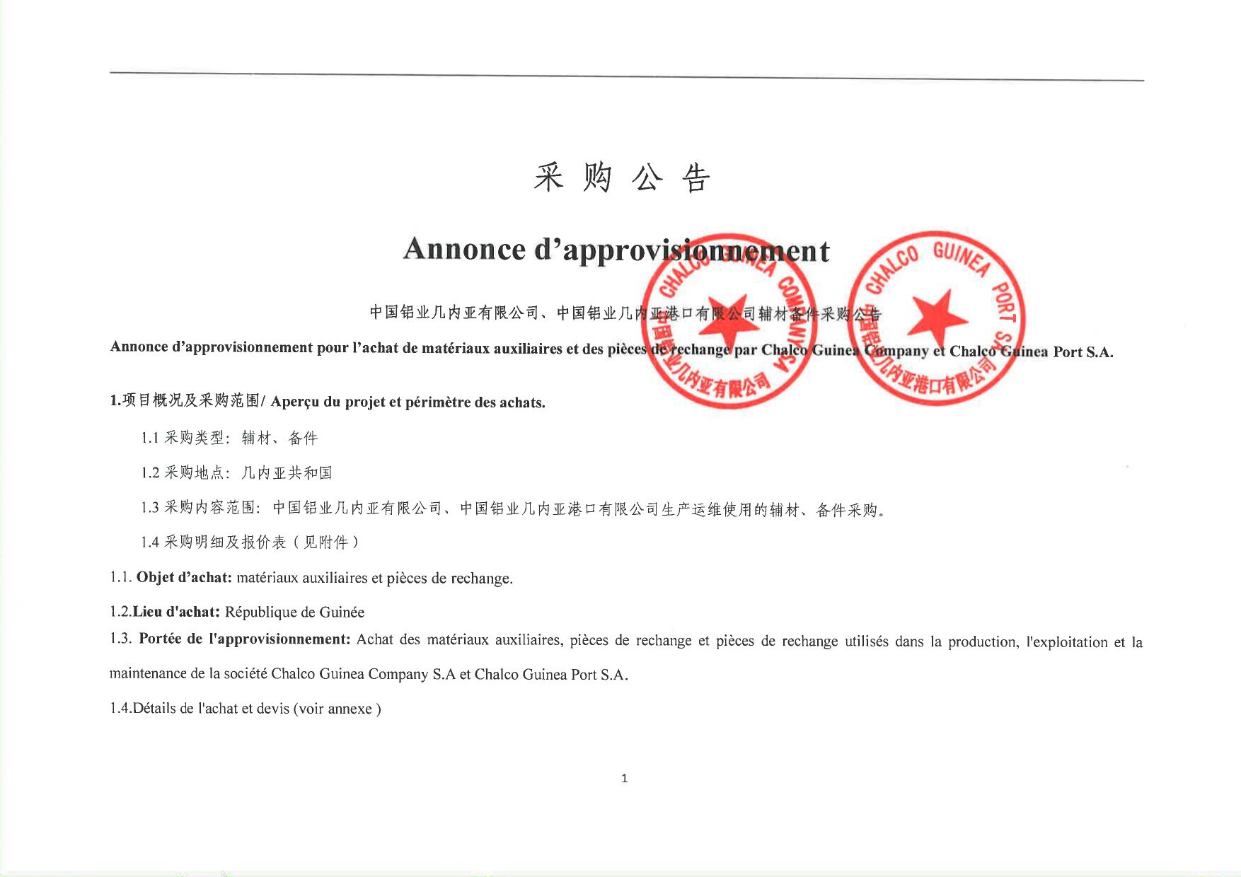 > Annonce d'approvisionement pour l'achat de matériaux auxiliaires et de pièces de rechange par Chalco Guinea Company S.A.