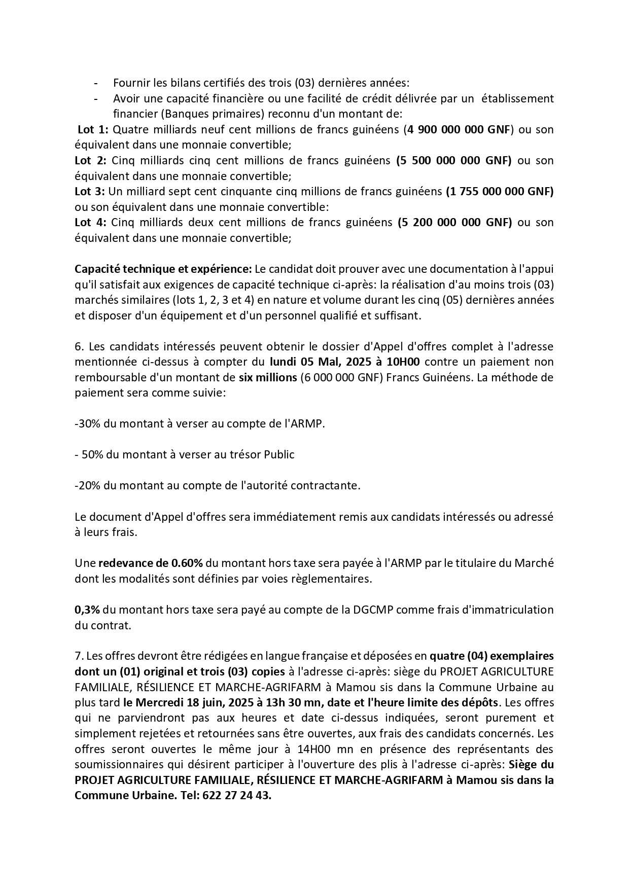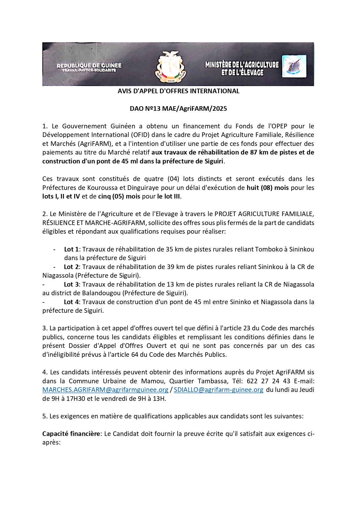 > Avis d'appel d'offres international pour le Marché relatif aux travaux de réhabilitation de 87 km de pistes et de construction d'un pont de 45 ml dans la préfecture de Siguiri.