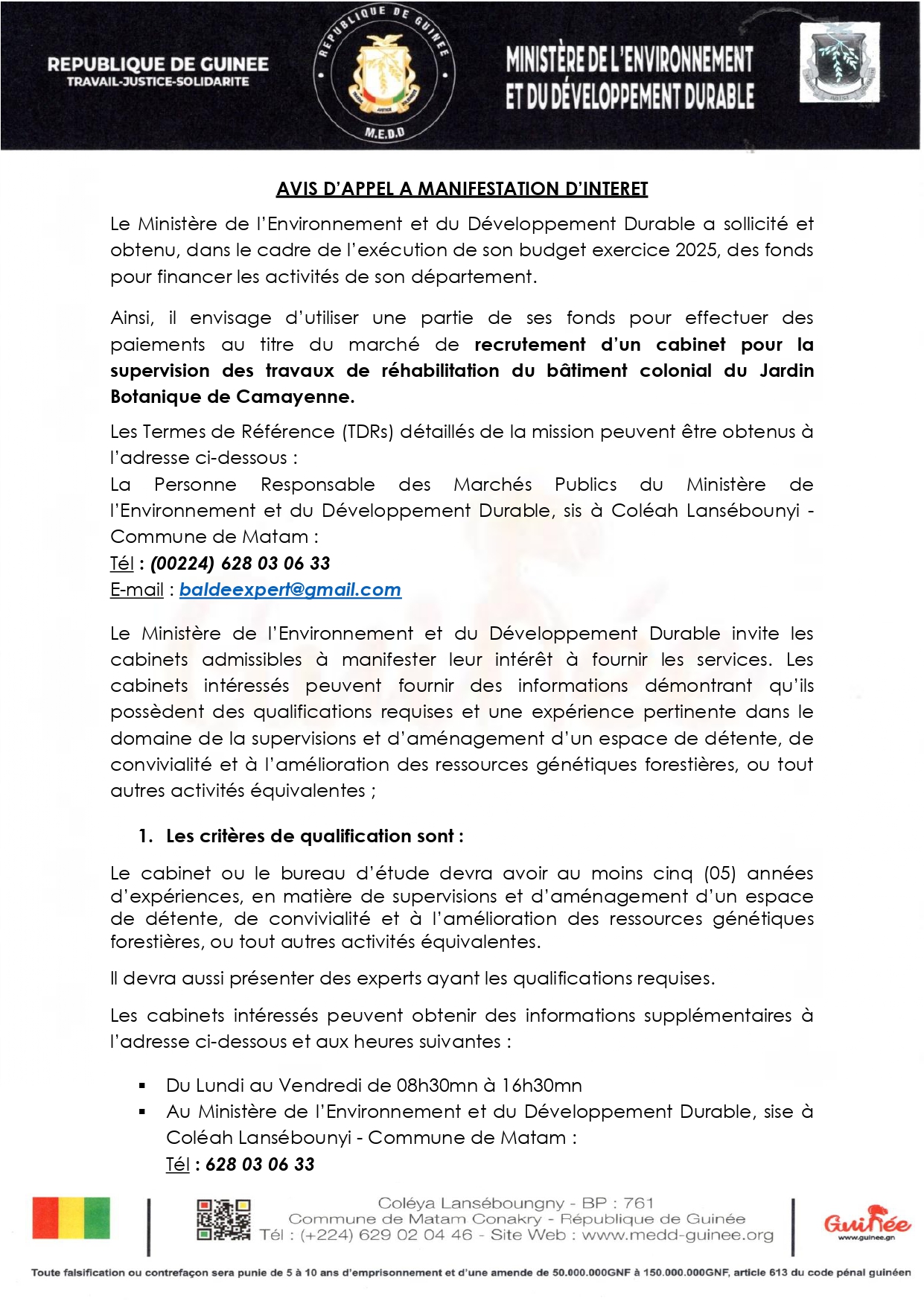 > Avis d'appel d'offres pour le recrutement d’un cabinet pour la supervision des travaux de réhabilitation du bâtiment colonial du Jardin Botanique de Camayenne