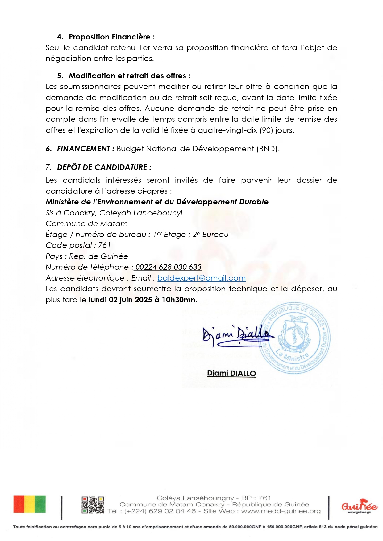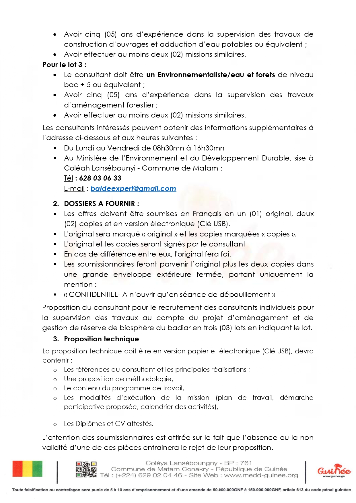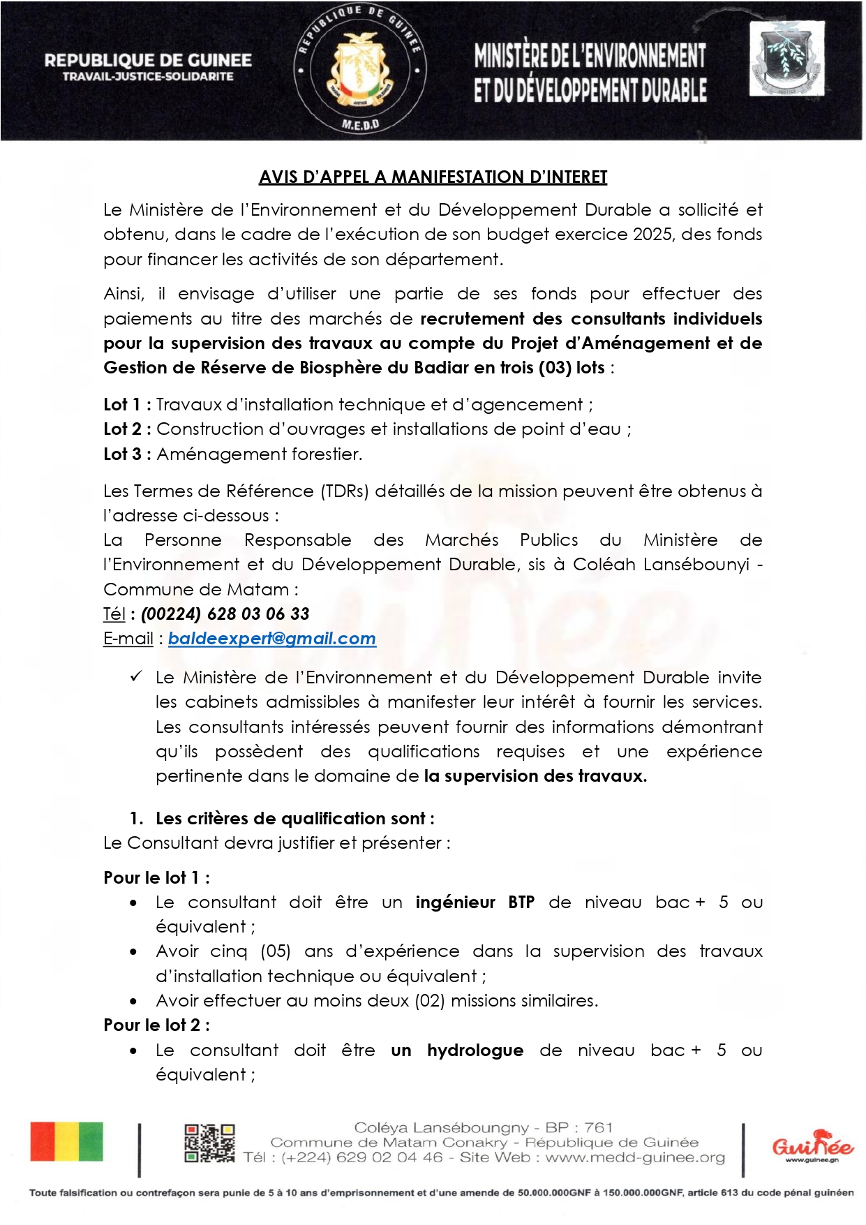 > Avis d'appel d'offres pour les marchés de recrutement des consultants individuels pour la supervision des travaux au compte du Projet d’Aménagement et de Gestion de Réserve de Biosphère du Badiar en trois (03) lots