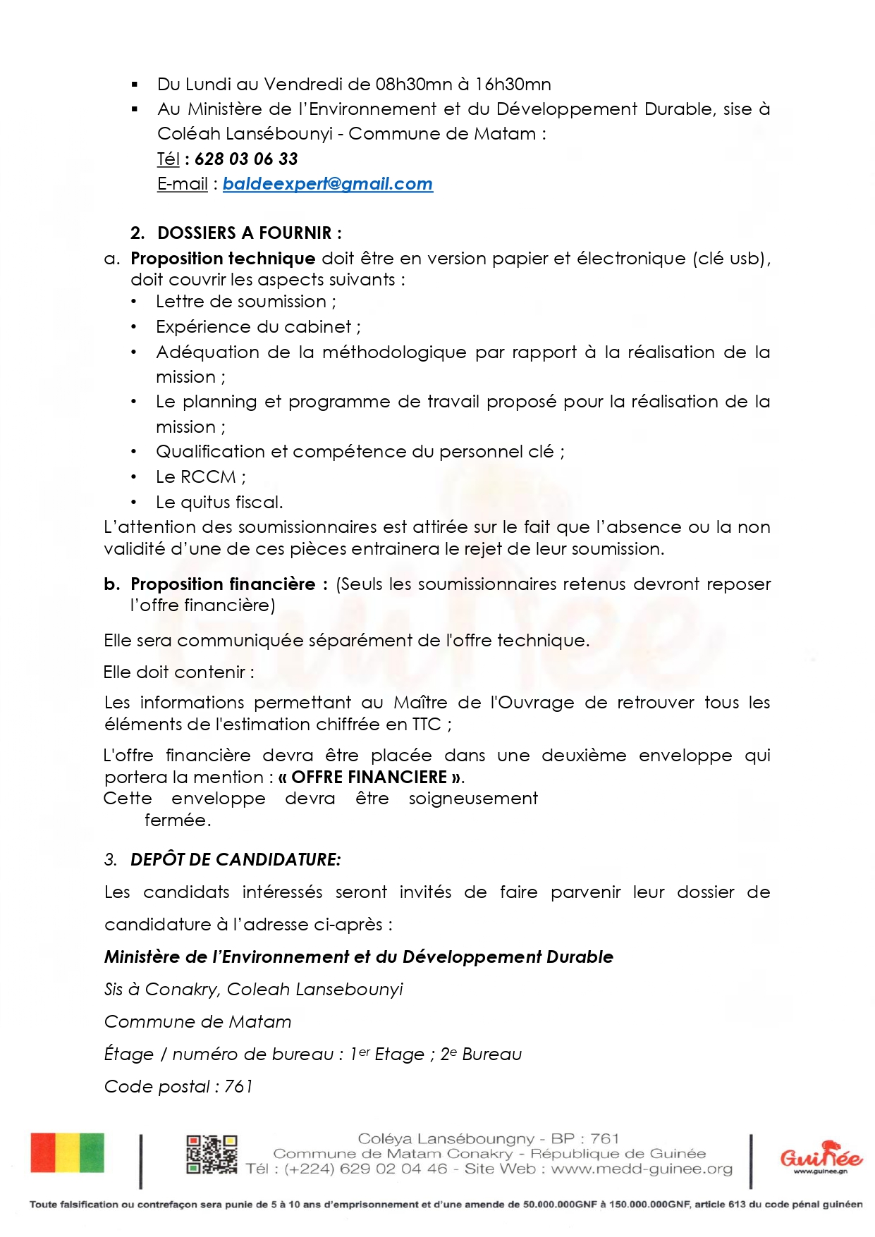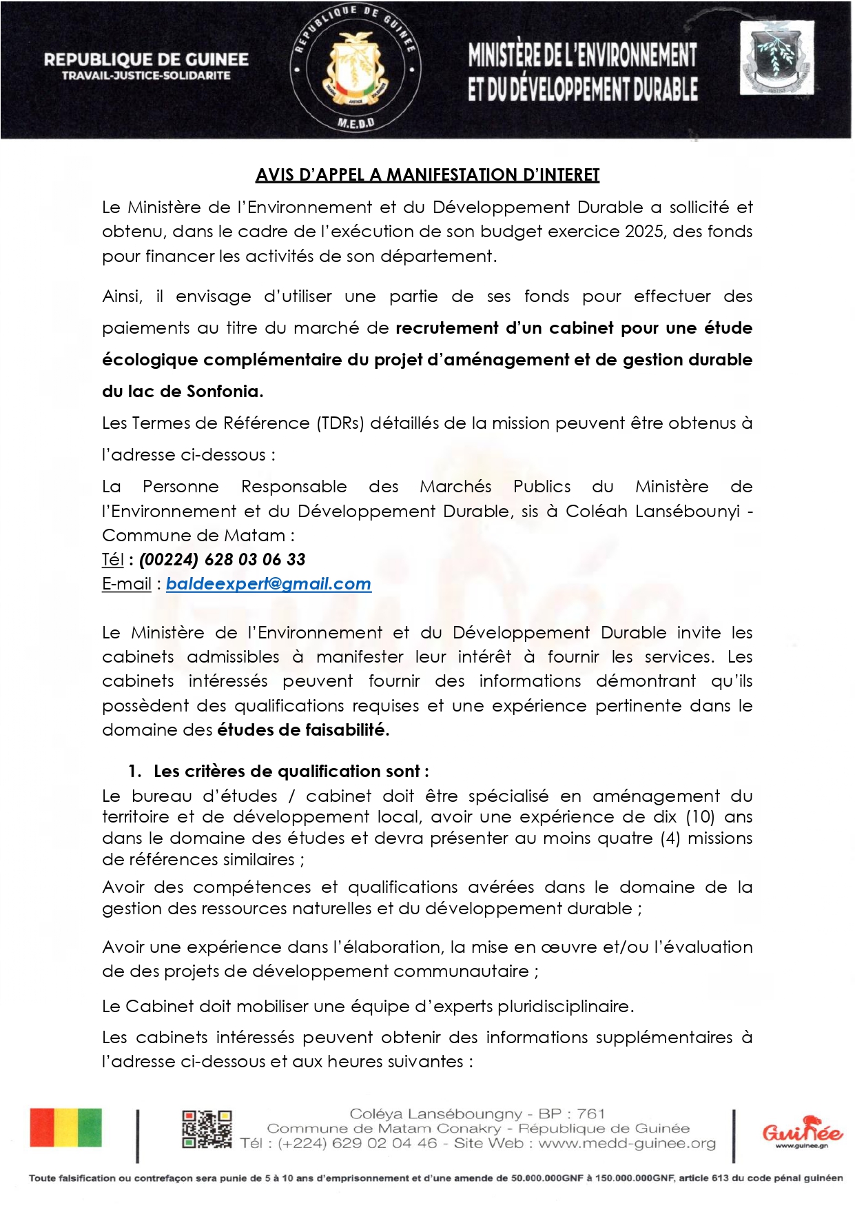 > Avis d'appel d'offres pour le marché de recrutement d’un cabinet pour une étude écologique complémentaire du projet d’aménagement et de gestion durable du lac de Sonfonia