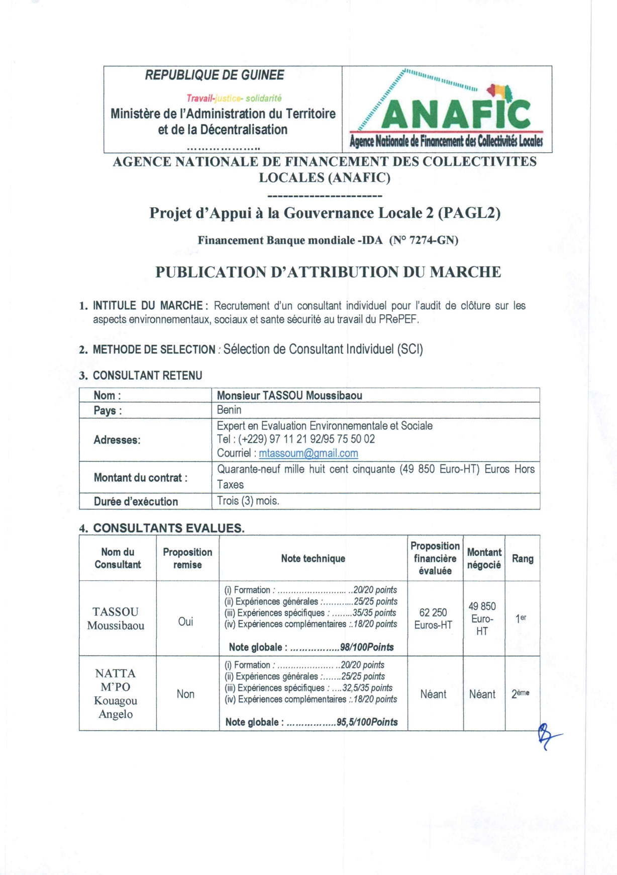 > PUBLICATION D’ATTRIBUTION DU MARCHE: