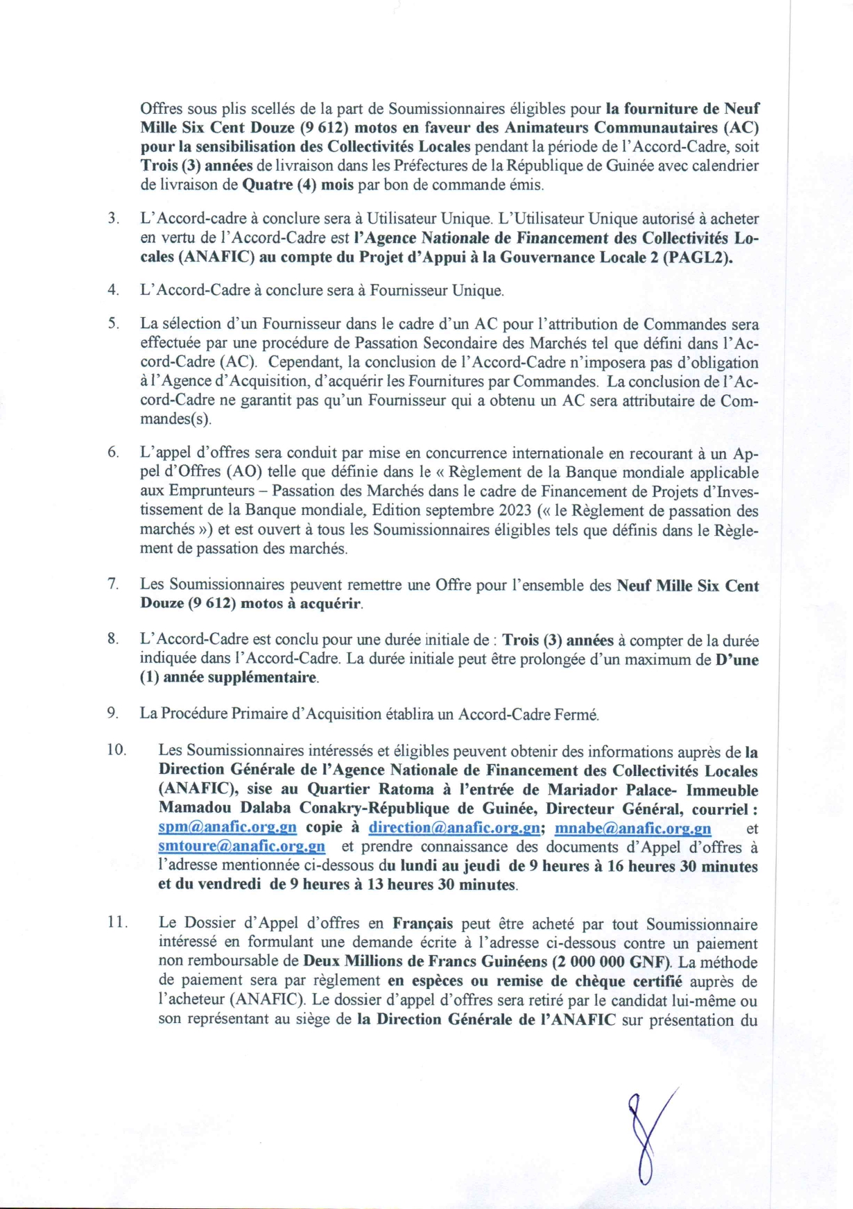 > Avis d'appel d'offres pour l'Acquisition de 9 612 motos en faveur des Animateurs Communautaires (AC) pour la sensibilisation des Collectivités Locales.
