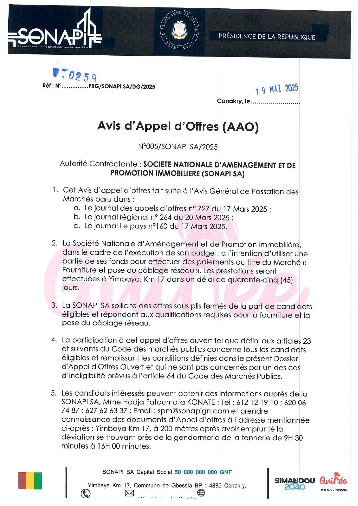 > Avis d'appel d'offres poule Marché « Fourniture et pose du câblage réseau ». Les prestations seront effectuées à Yimbaya, Km 17 dans un délai de quarante-cinq (45) jours.