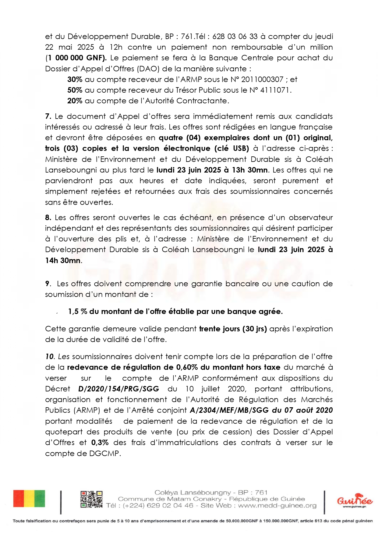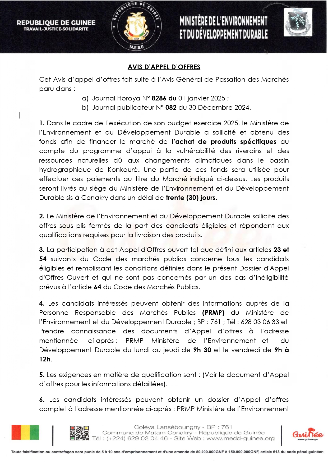 > Avis d'appel d'offres pour le marché de l’achat de produits spécifiques au compte du programme d’appui à la vulnérabilité des riverains et des ressources naturelles dû aux changements climatiques dans le bassin hydrographique de Konkouré