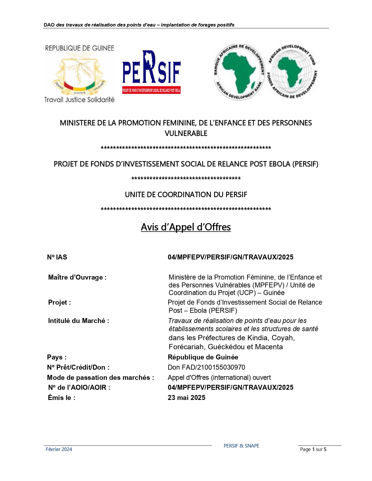 > Avis d'appel d'offres pour les Travaux de réalisation de points d’eau pour les établissements scolaires et les structures de santé dans les Préfectures de Kindia, Coyah, Forécariah, Guéckédou et Macenta