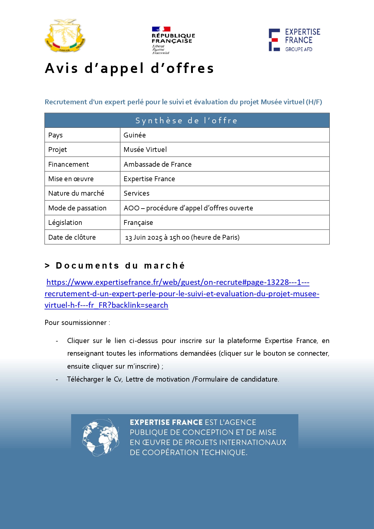 > Avis d’appel d’offres pour le Recrutement d'un expert perlé pour le suivi et évaluation du projet Musée virtuel (H/F)