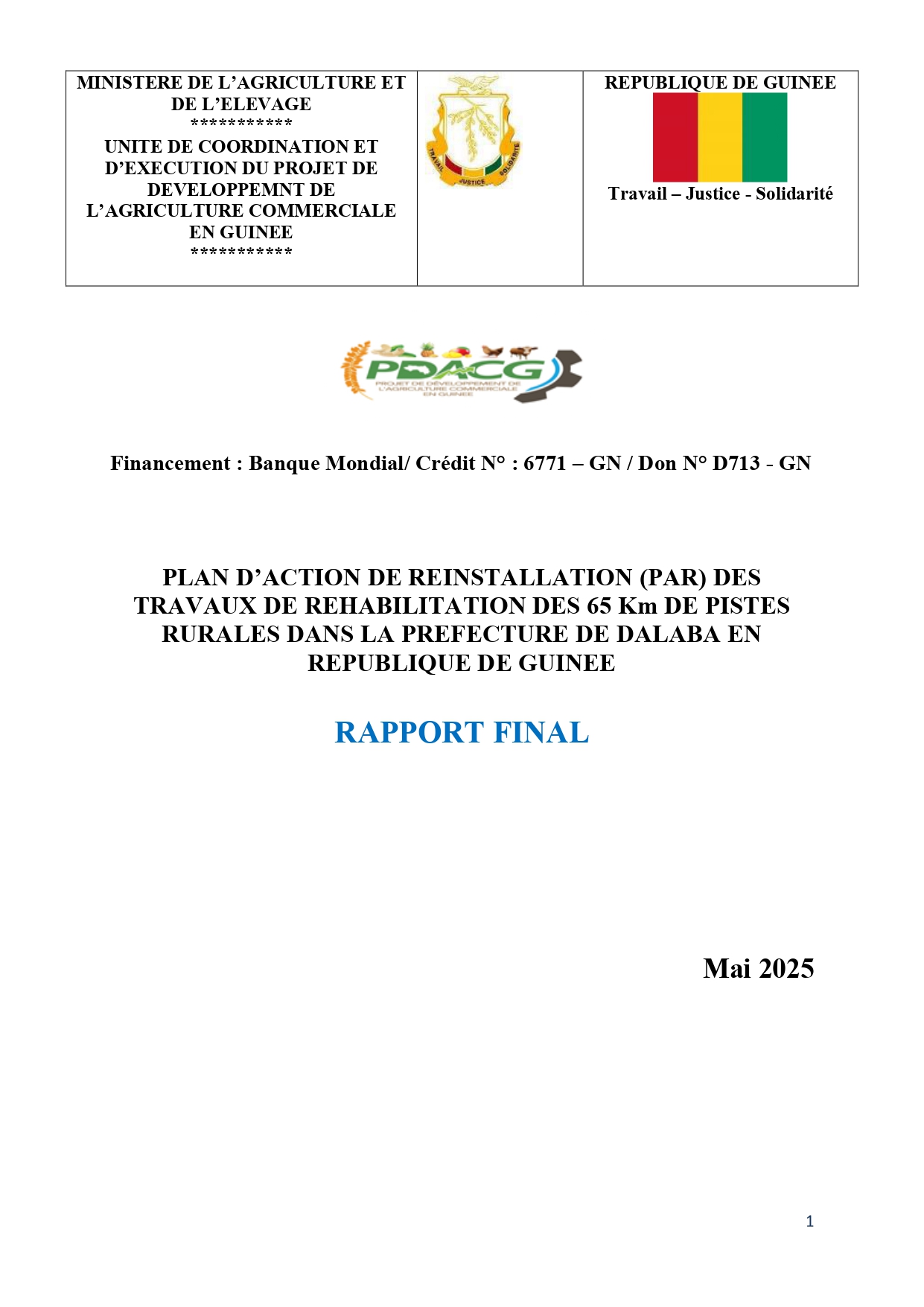 > PLAN D’ACTION DE REINSTALLATION (PAR) DES TRAVAUX DE REHABILITATION DES 65 Km DE PISTES RURALES DANS LA PREFECTURE DE DALABA EN REPUBLIQUE DE GUINEE