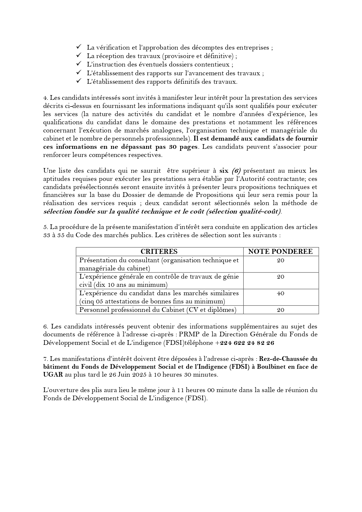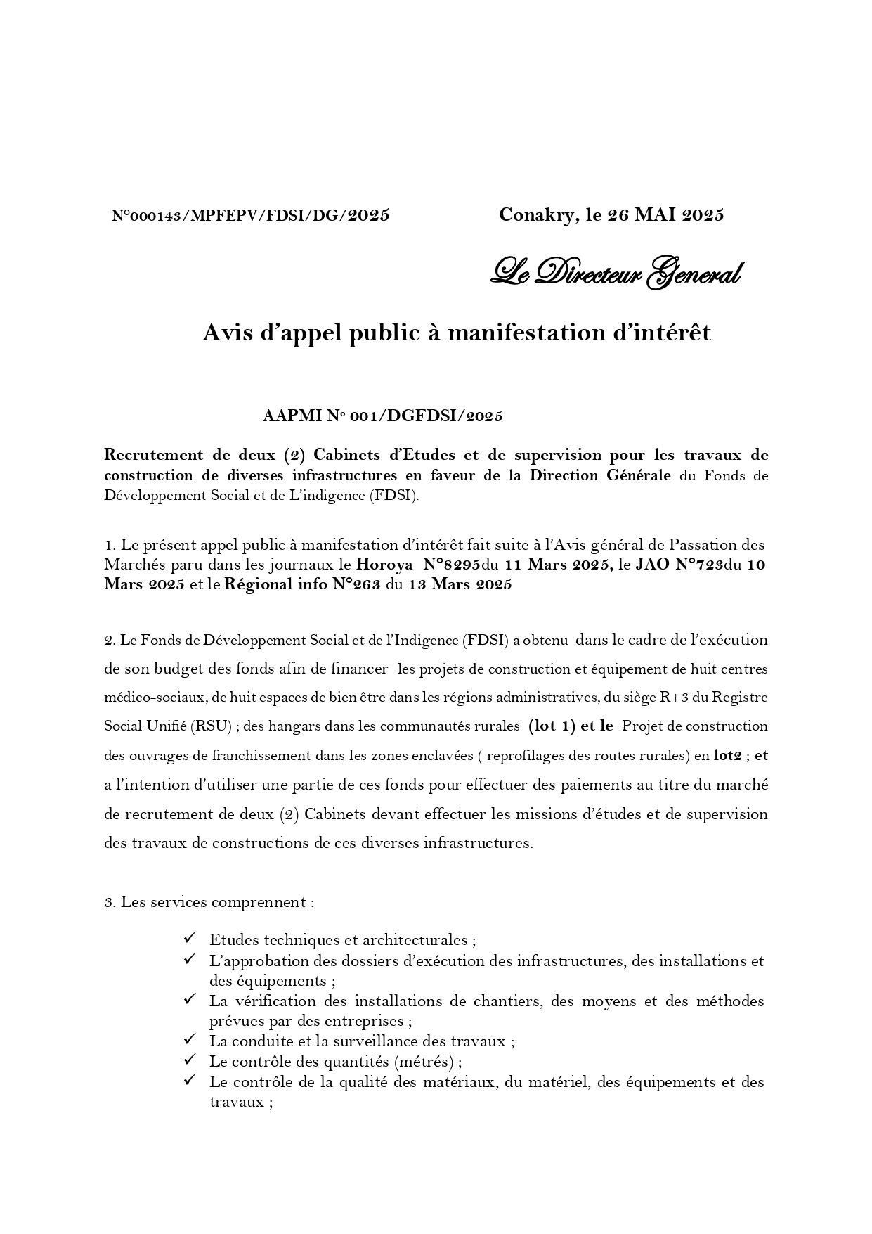 > Avis d’appel public à manifestation d’intérêt pour le Recrutement de deux (2) Cabinets d’Etudes et de supervision pour les travaux de construction de diverses infrastructures