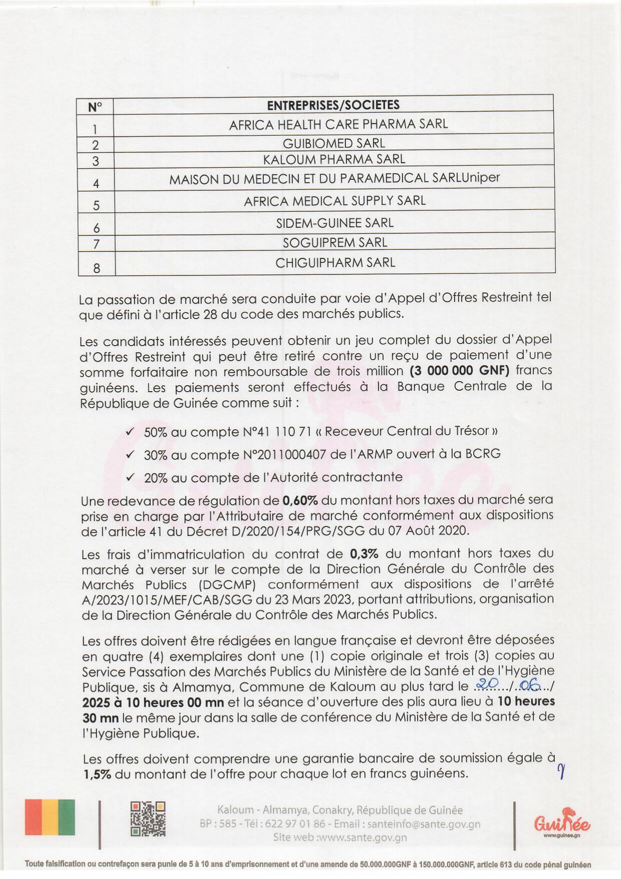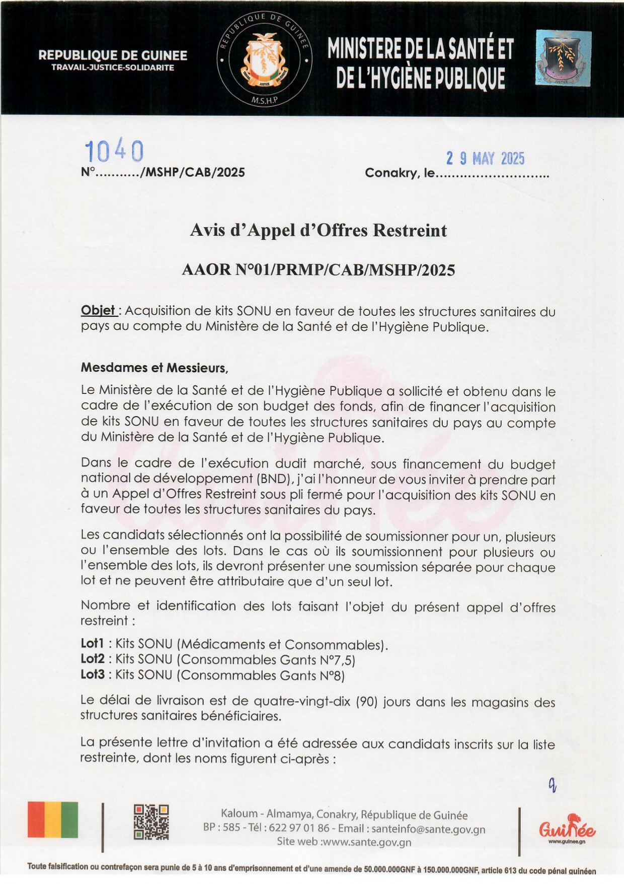 > Avis d'appel d'offres pour l'Acquisition de kits SONU en faveur de toutes les structures sanitaires du pays au compte du Ministère de la Santé et de l'Hygiène Publique