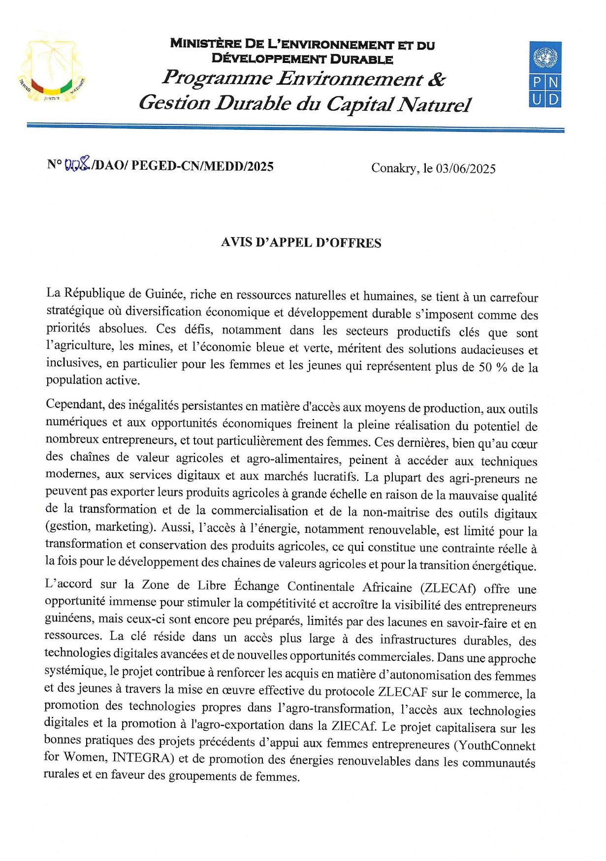 > PEGED: Avis d'appel d'offres pour la Travaux de réalisation de deux forages hydrauliques d’une capacité minimale de 2 m3/h équipé d’une pompe immergée avec la construction d’un château métallique de 10 m3 d’eau à Bomboly (Ratoma), Thianguel Bory, (Lélouma) réparties en deux (02) lots distincts pour un délai d’exécution ne dépassant pas deux (02) mois au compte du PEGED