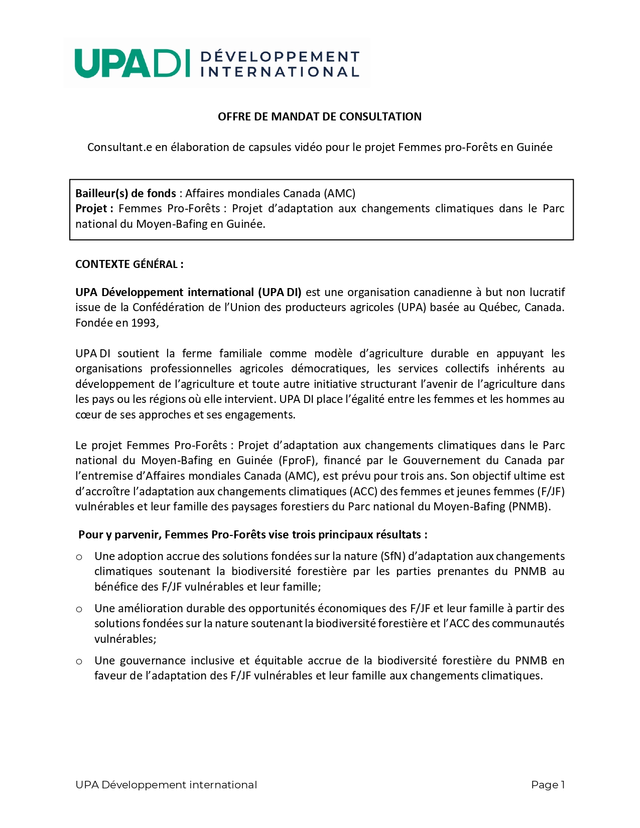 > OFFRE DE MANDAT DE CONSULTATION: Consultant.e en élaboration de capsules vidéo pour le projet Femmes pro-Forêts en Guinée