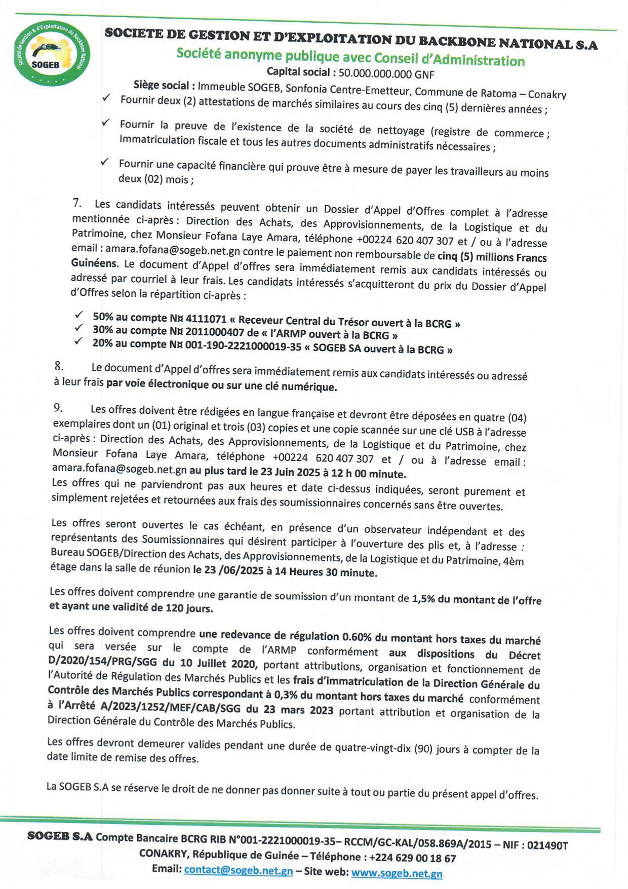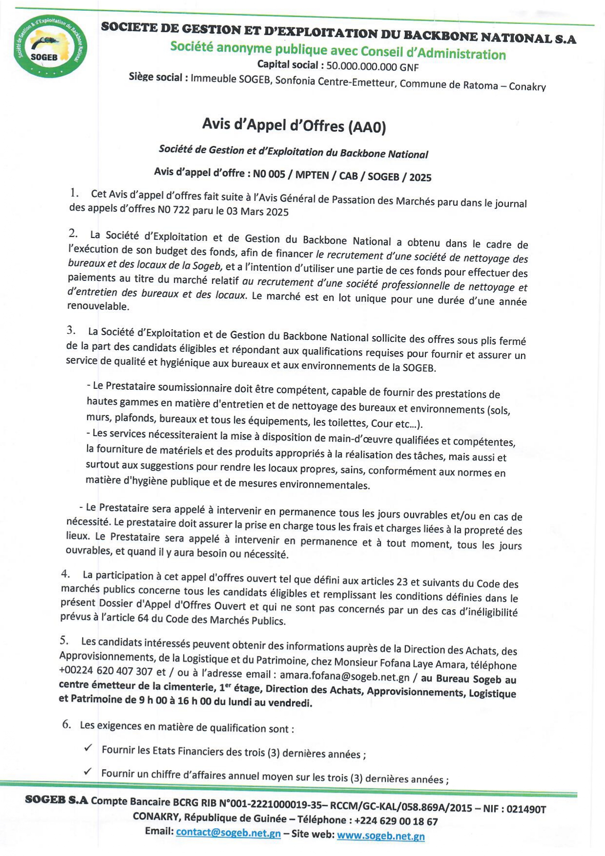 > Avis d'appel d'offres pour le marché relatif au recrutement d'une société professionnelle de nettoyage et d'entretien des bureaux et des locaux