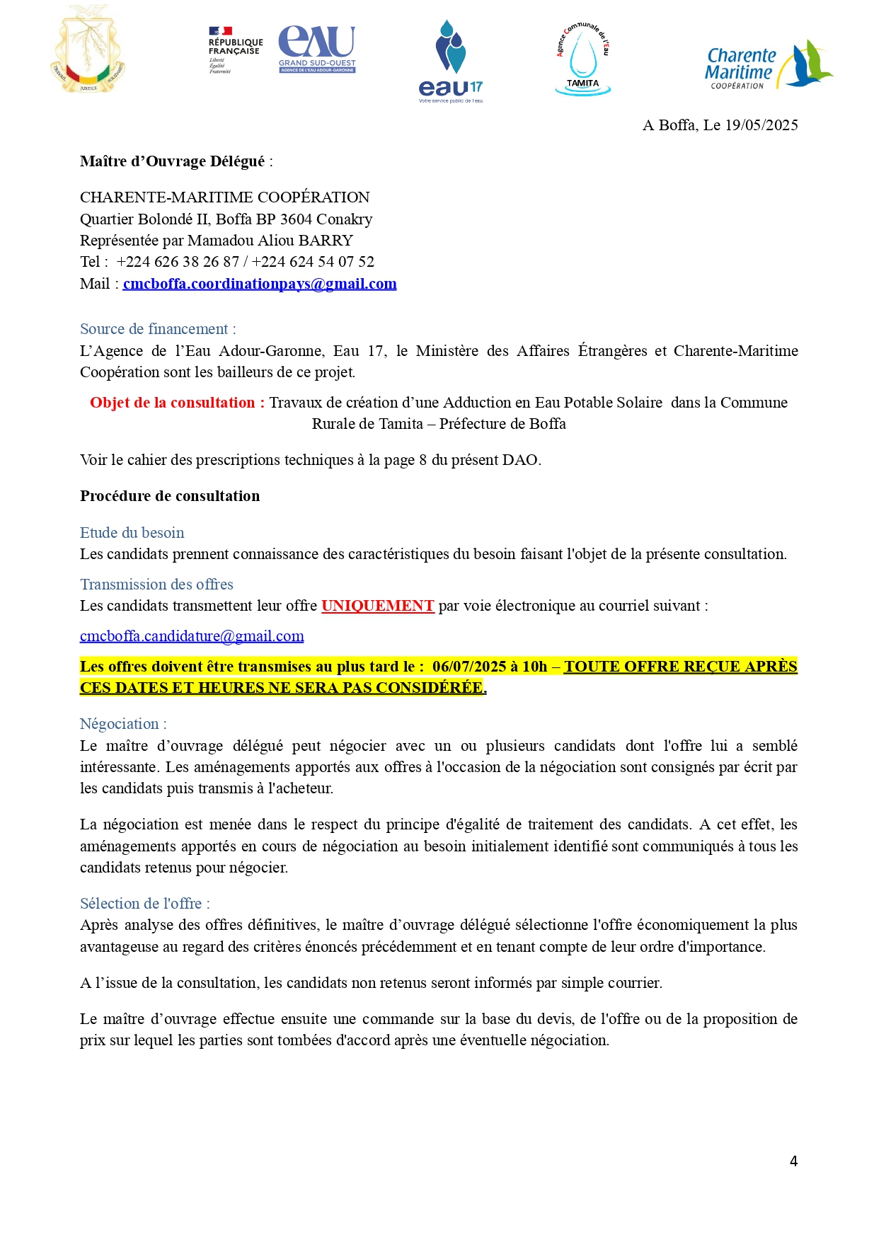 > Avis D'Appel d’offre Pour Des Travaux de création d’une Adduction en Eau Potable Solaire dans la Commune Rurale de Tamita – Préfecture de Boffa