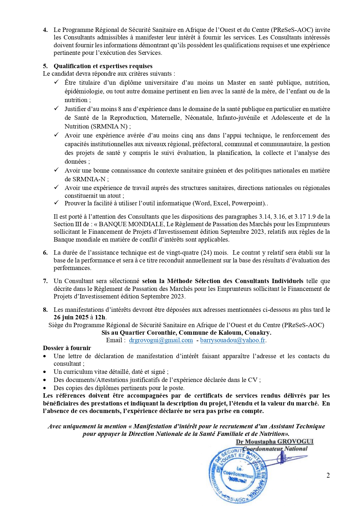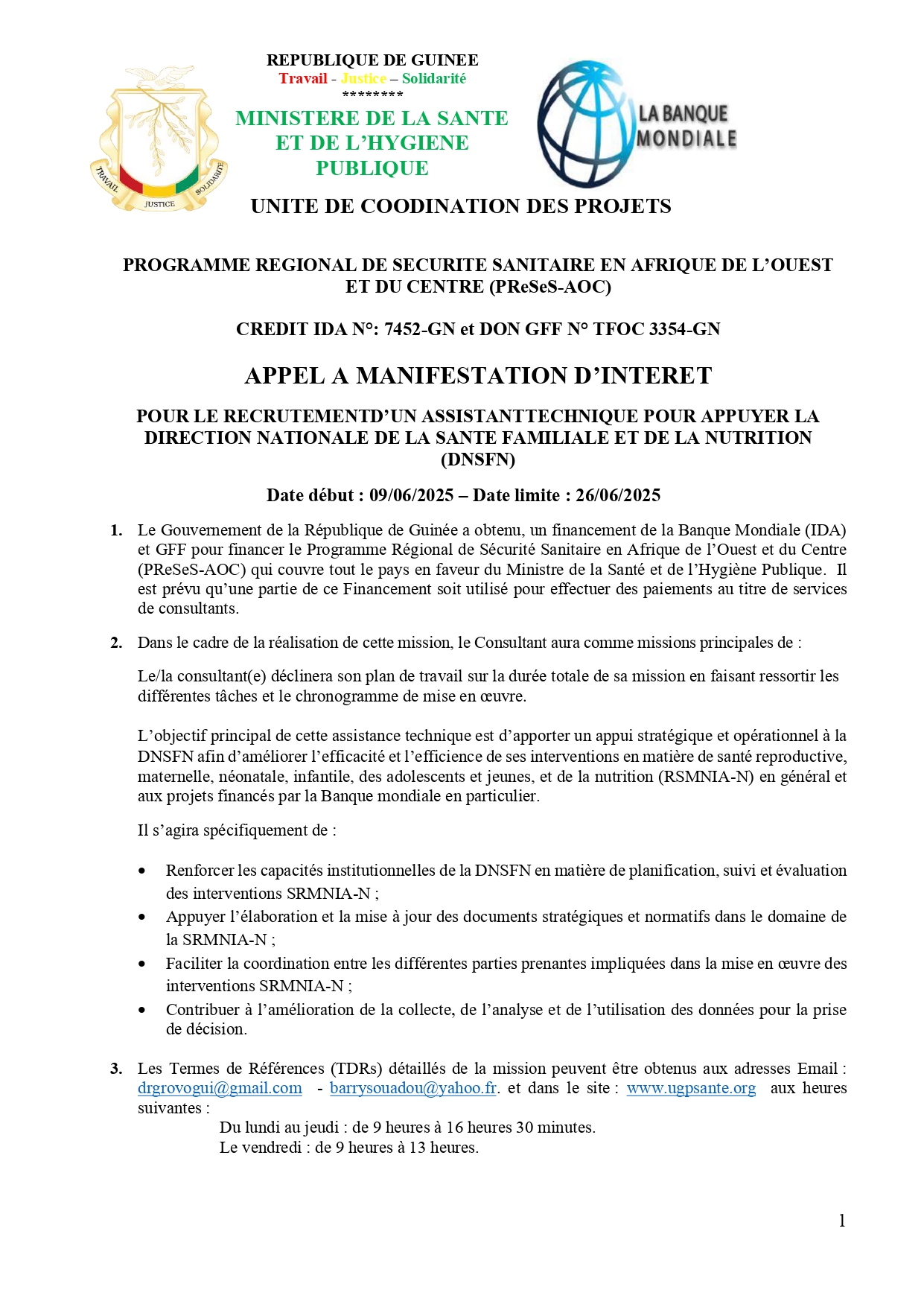 > PReSeS-AOC: APPEL A MANIFESTATION D’INTERET POUR LE RECRUTEMENTD’UN ASSISTANTTECHNIQUE POUR APPUYER LA DIRECTION NATIONALE DE LA SANTE FAMILIALE ET DE LA NUTRITION (DNSFN)