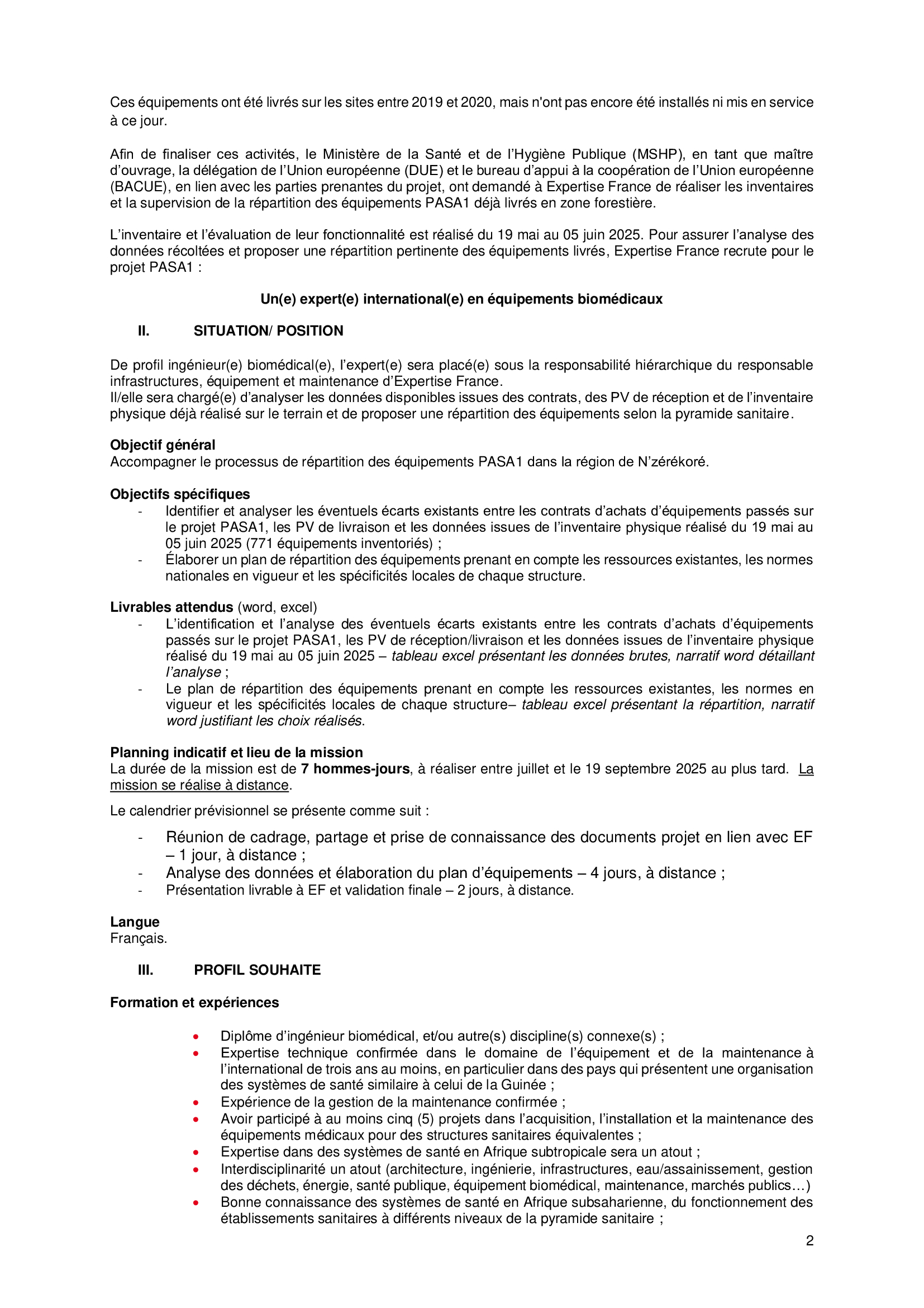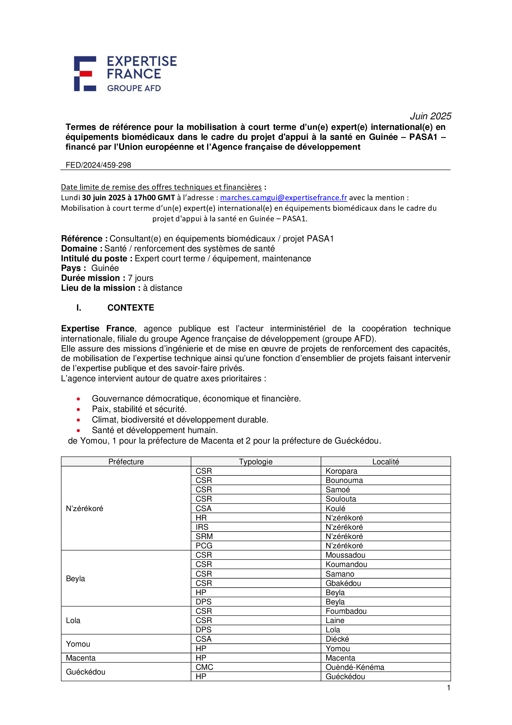 > Termes de référence pour la mobilisation à court terme d’un(e) expert(e) international(e) en équipements biomédicaux dans le cadre du projet d'appui à la santé en Guinée – PASA1 – financé par l’Union européenne et l’Agence française de développement