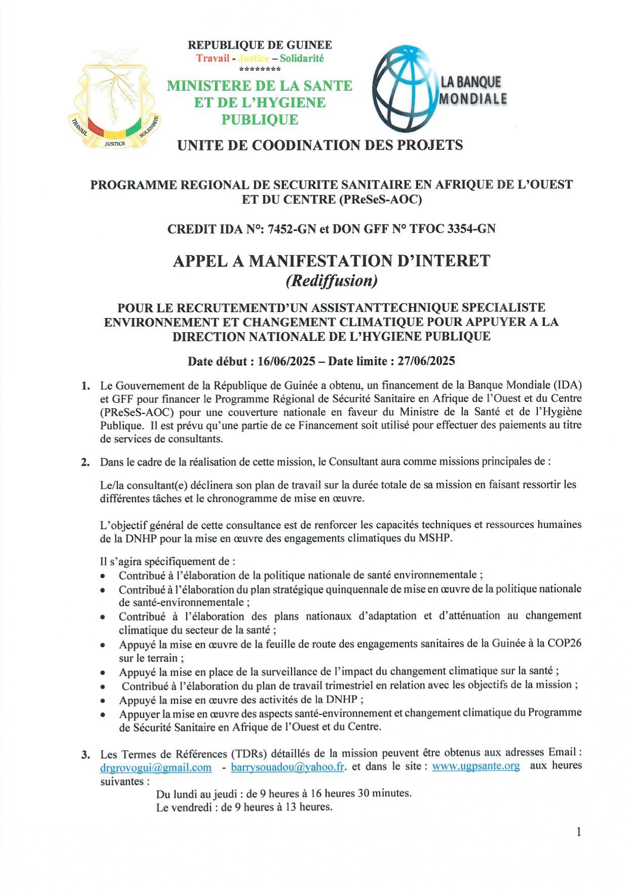 > APPEL A MANIFESTATION D’INTERET POUR LE RECRUTEMENTD’UN ASSISTANTTECHNIQUE SPECIALISTE ENVIRONNEMENT ET CHANGEMENT CLIMATIQUE POUR APPUYER A LA DIRECTION NATIONALE DE L’HYGIENE PUBLIQUE