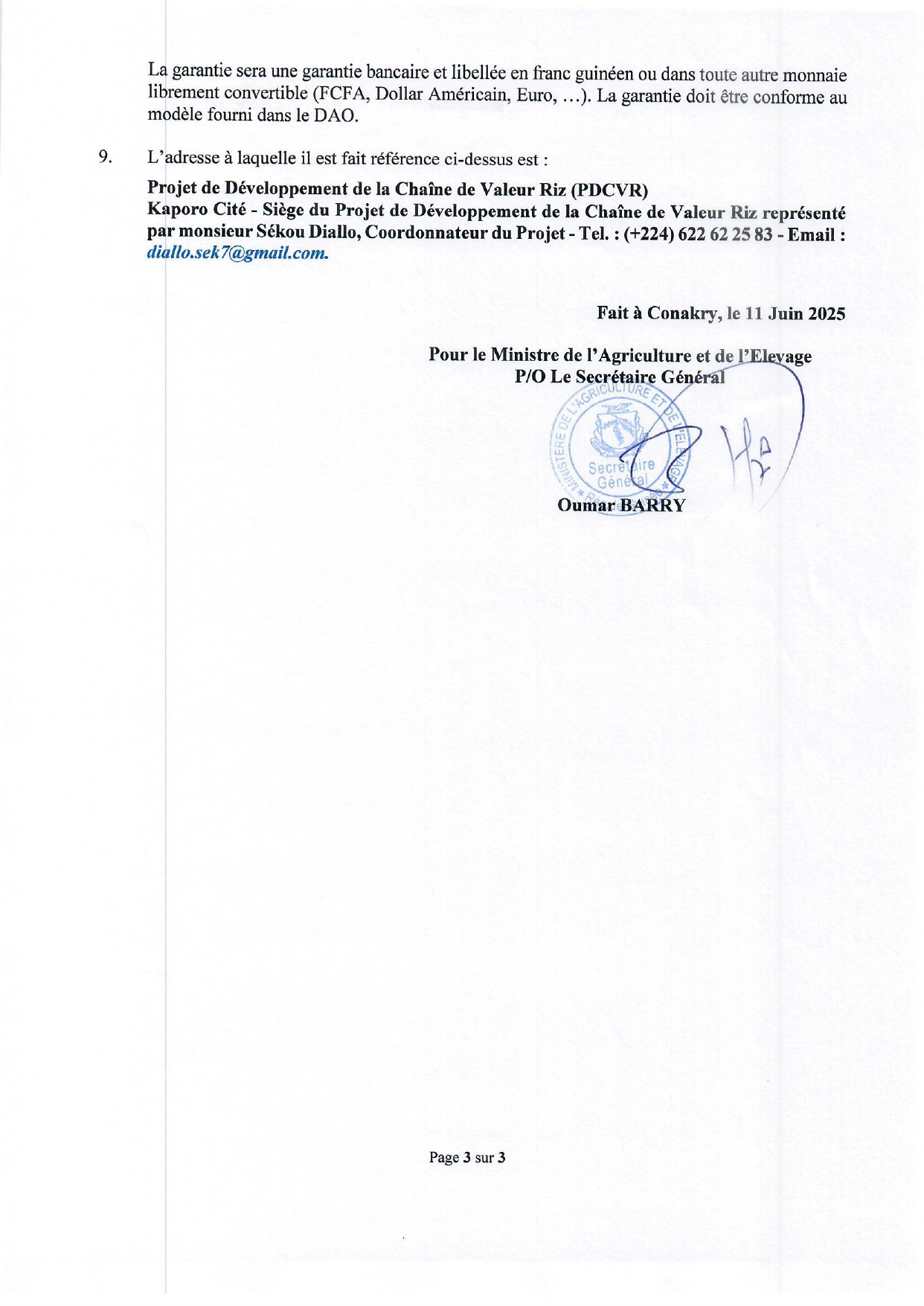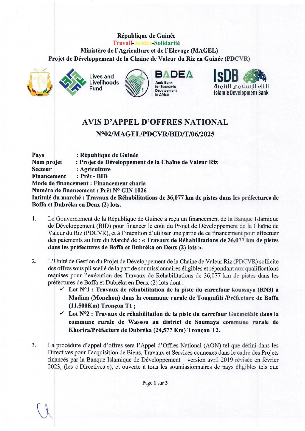 > Avis d'appel d'offres national pour des Travaux de Réhabilitations de 36,077 km de pistes dans les préfectures de Boffa et Dubréka en Deux (2) lots.