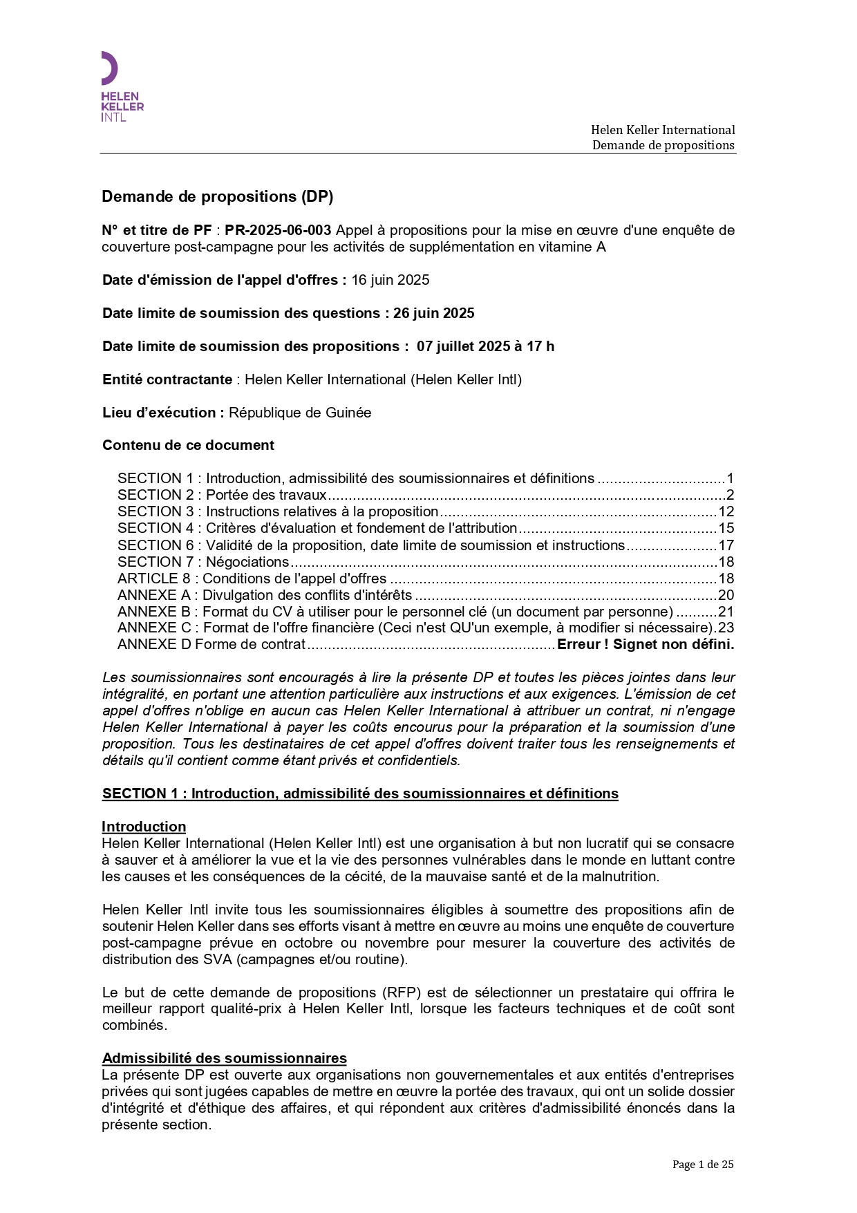 > Appel à propositions pour la mise en œuvre d'une enquête de couverture post-campagne pour les activités de supplémentation en vitamine A