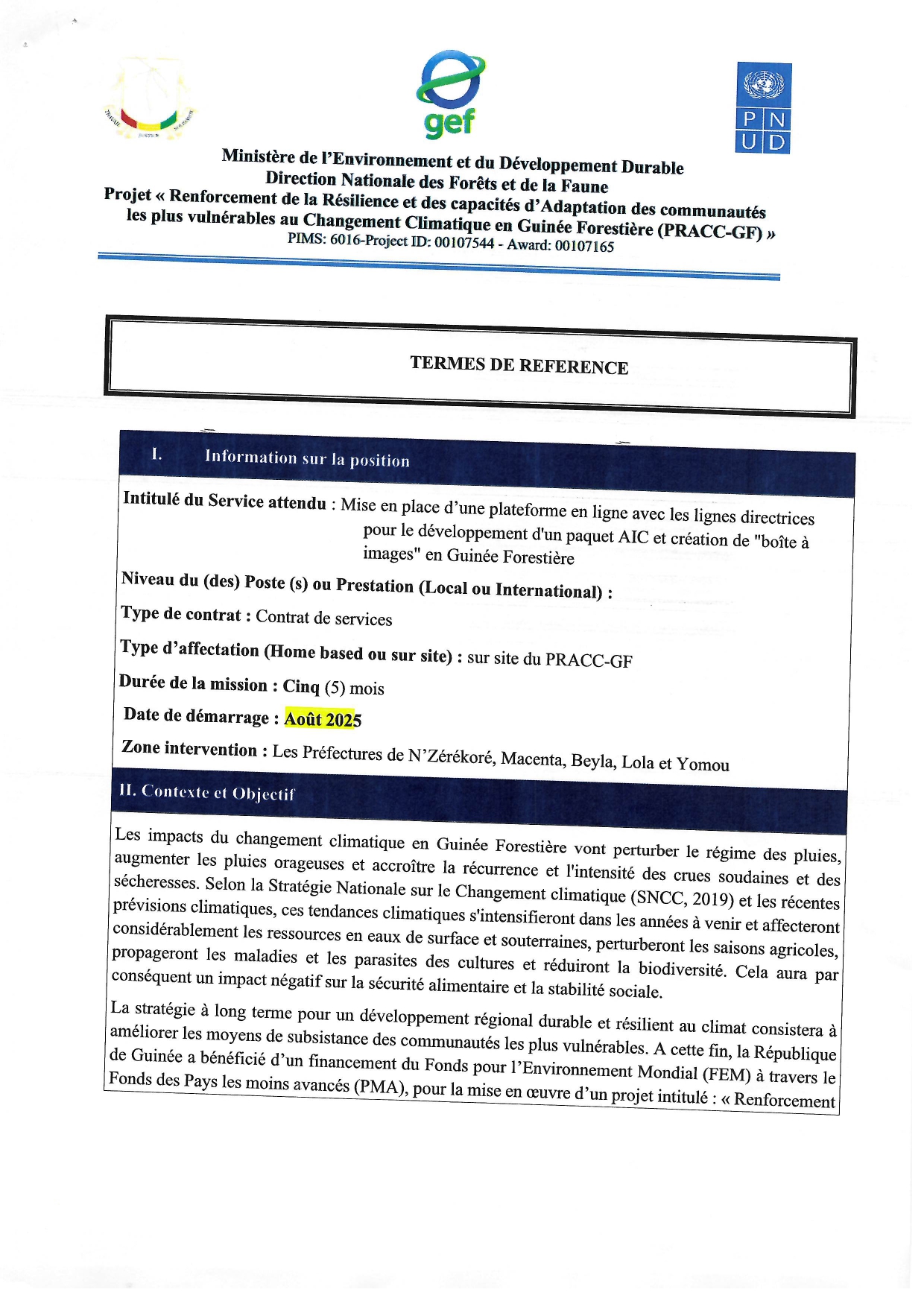 > Avis d'appel d'offres pour la Mise en place d'une plateforme en ligne avec les lignes directrices pour le développement d'un paquet AIC et création de "boîte à images" en Guinée Forestière
