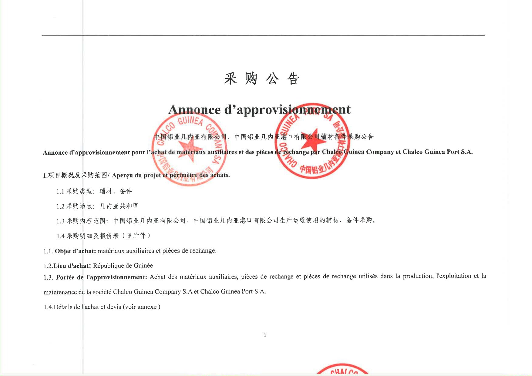 > Annonce d'approvisionement pour l'achat de matériaux auxiliaires et de pièces de rechange par Chalco Guinea Company S.A.